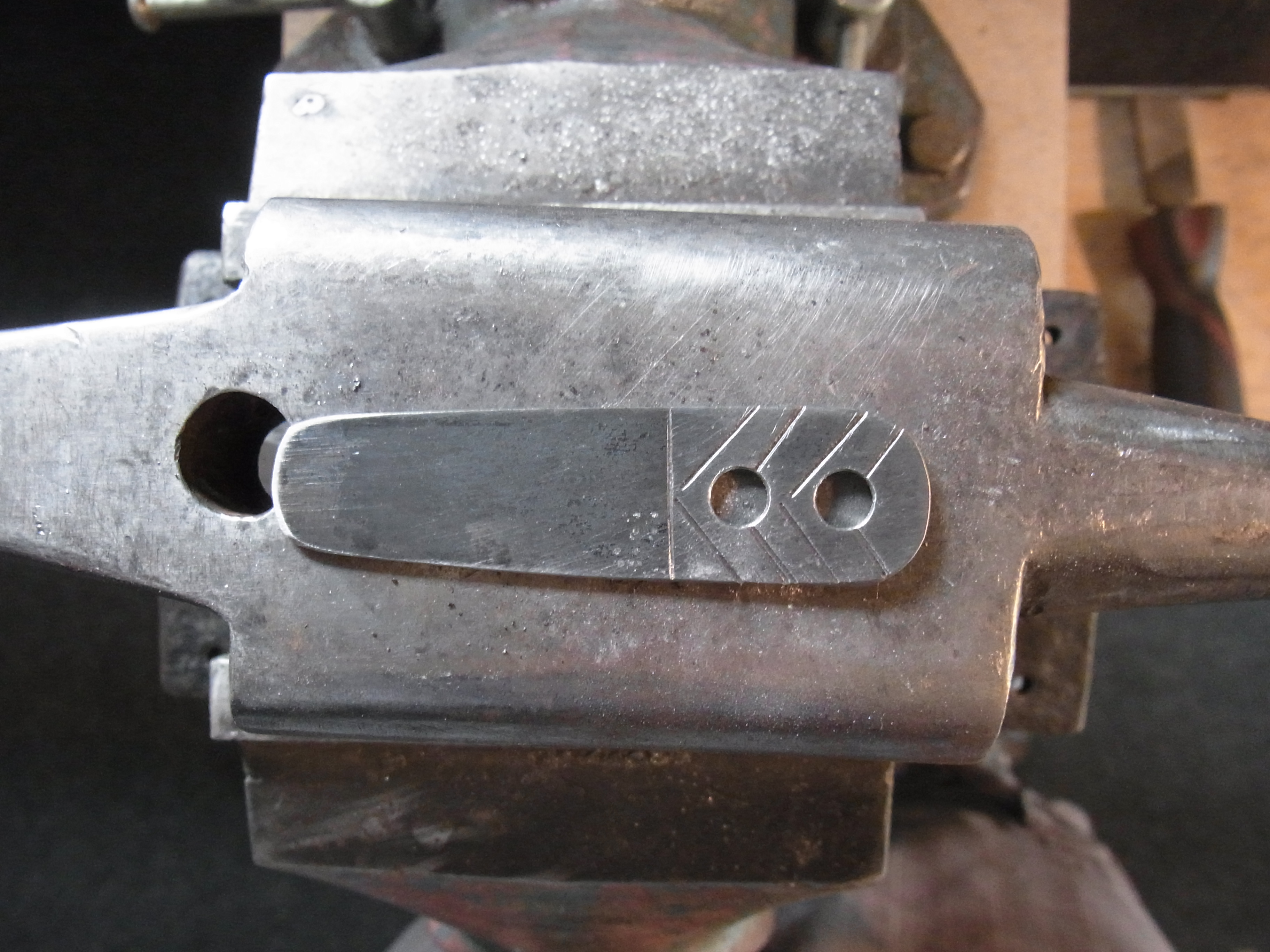 Die Verzierungen Schlage ich mit einem stumpfen Meißel ein. Um die Linien nicht daneben zu setzen lege ich meine Handkante auf das Werkstück und halte den Meißel sehr nahe an der Schneidkante. Hier ist das Ergebnis nachdem auch die Nietlöcher dazu gekommen sind.