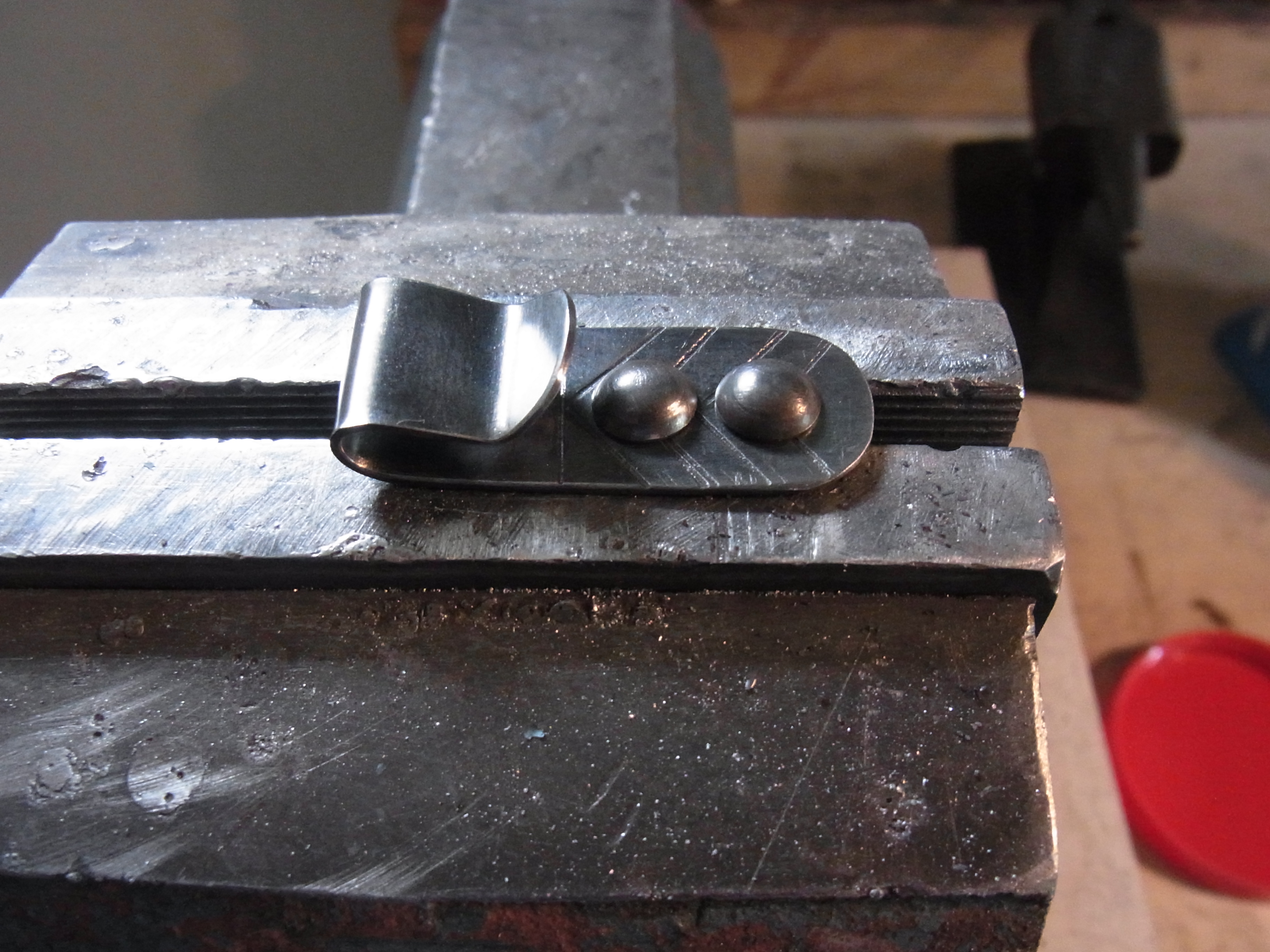 Zum Schluss verstärke ich die Einschnürung zwischen Schlaufe und dem Rest des Bleches noch mit einem stumpfen Meißel. Dazu braucht das Werkstück ein Gegenlager…..der Holzklotz auf dem der Schraubstock steht ist ideal.
