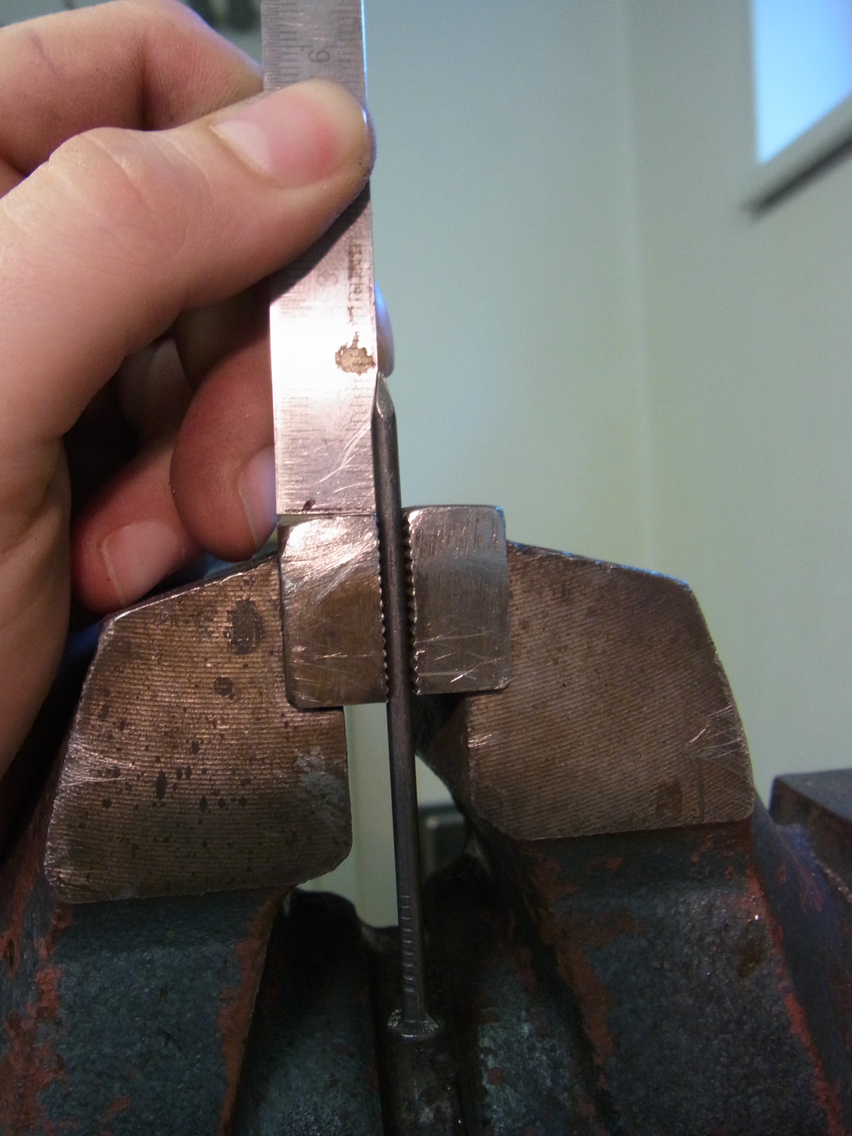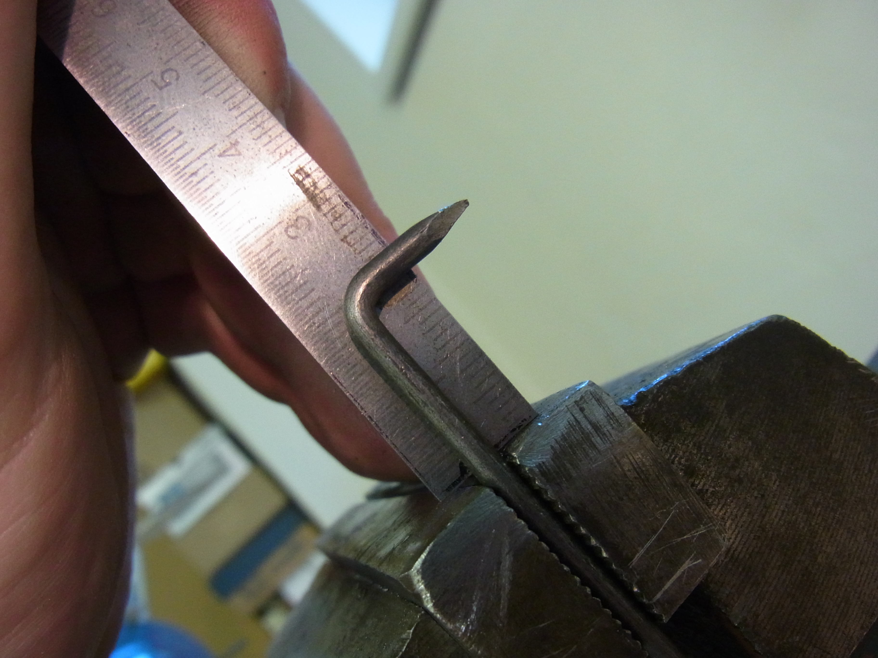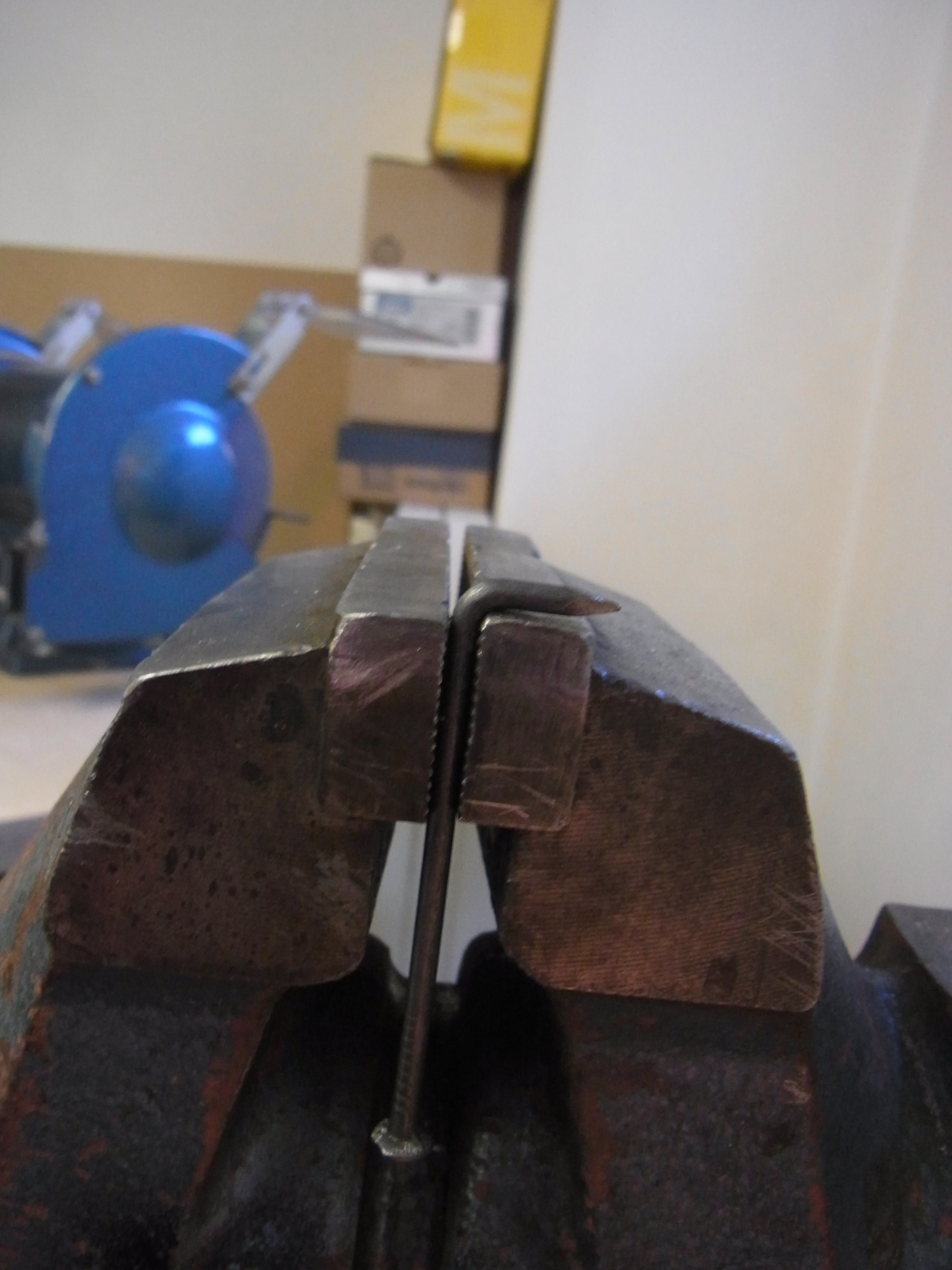 Ab der zweiten Biegung muss drauf geachtet werden das der bereits gebogene Bereich am Schraubstock vorbei schwenken kann. (den Nagel habe ich zu kurz gewählt….daher musste ich vor der letzten Biegung den Kopf absägen)