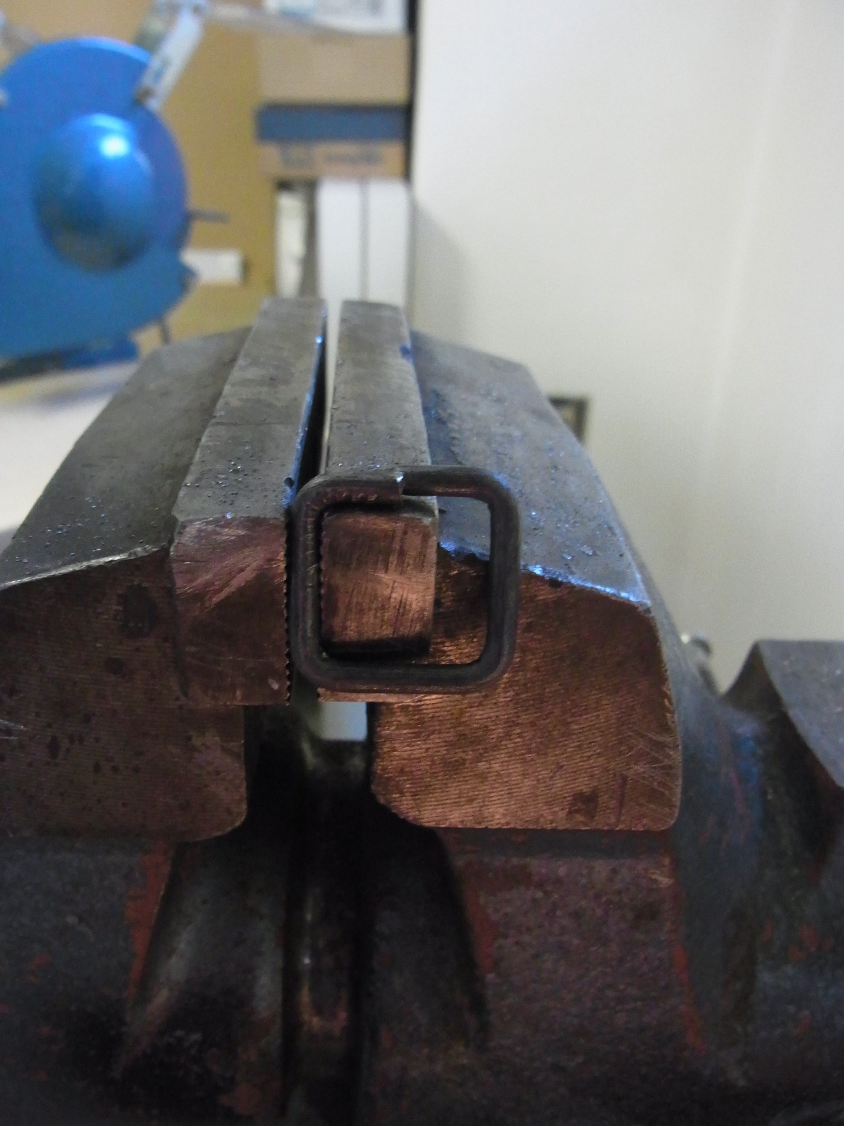 Als letzten Schritt am Schraubstock schlage ich die Schlaufe mit dem Gummihammer noch zu einer Seite um damit ich Freigang zur kettenhaube bekomme.