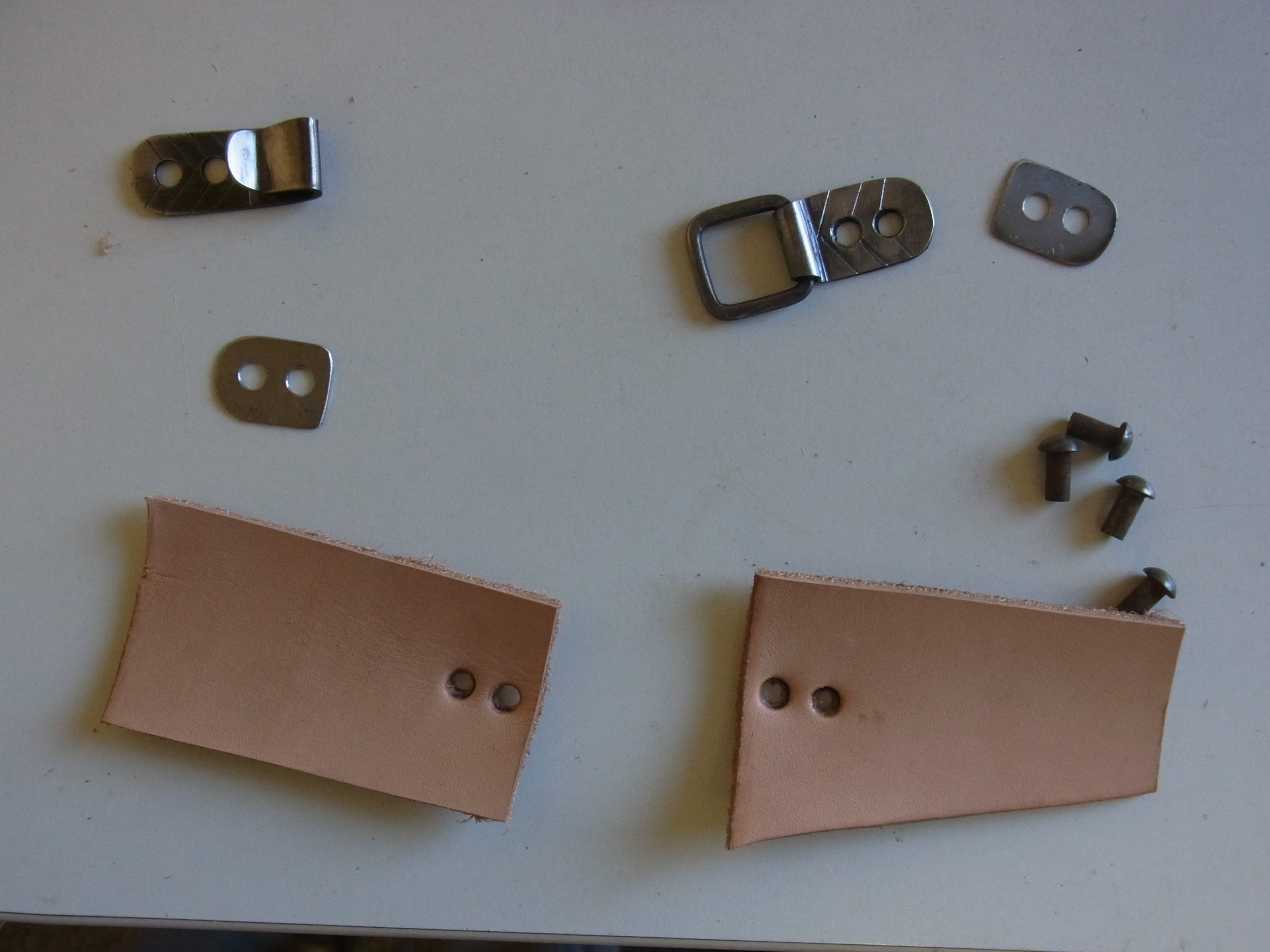 Jetzt kommen wir noch zur Montage. Hierzu loche ich Lederstücke vor (ich werde es nicht direkt auf das Kettengeflecht nieten sondern über ein Unterleder aufnähen um keinen großen Aufwand bei Änderungen zu haben), und fertige Gegenhalteplatten aus 0,8mm Blech an.