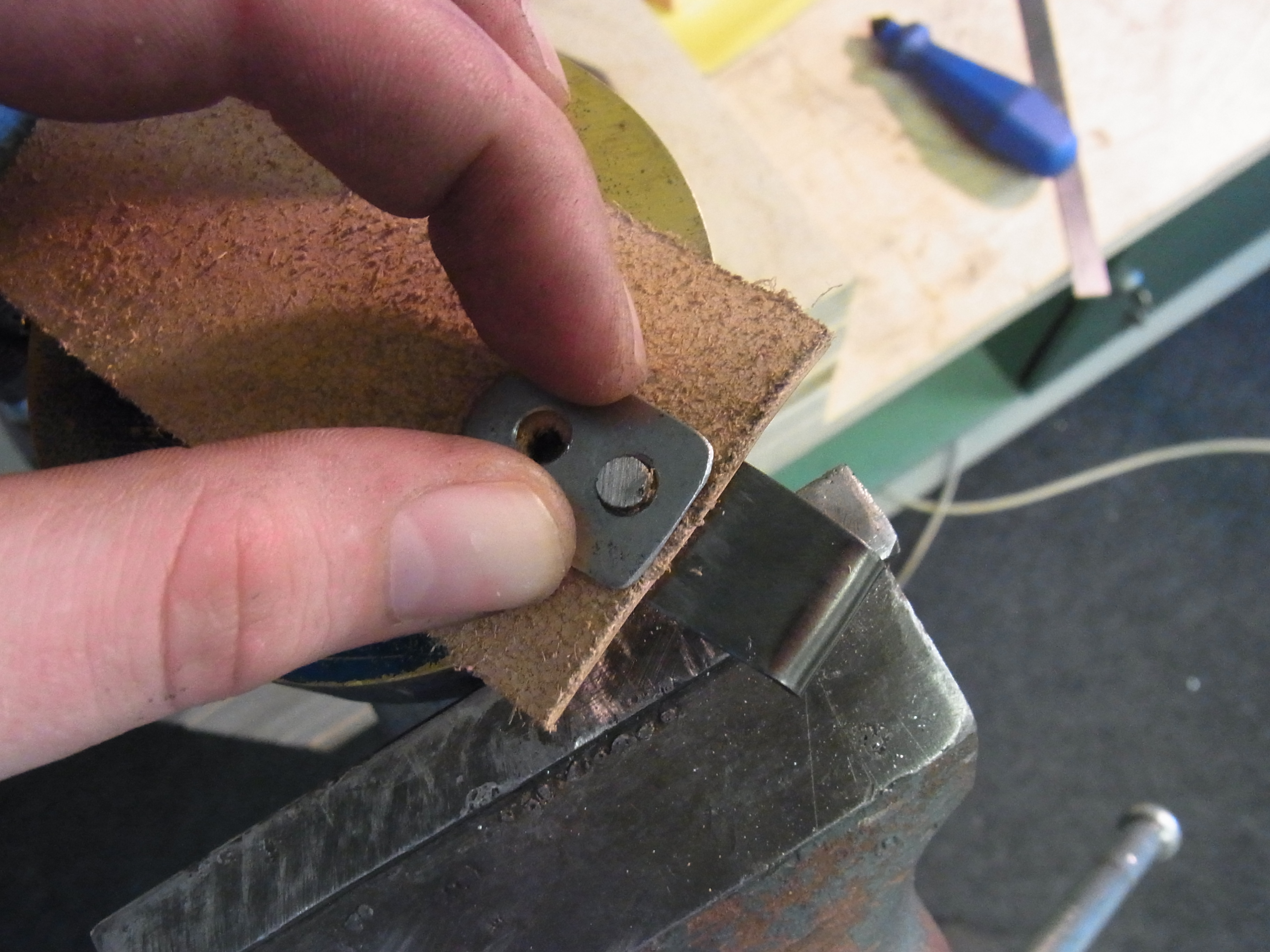 Zuerst kommt das Halteblech dran. Das Blech wird grob vorgeschnitten und versäubert. Zum Biegen nutze ich wieder das Scharnierwerkzeug und einen Schraubstock. (Sowohl beim Haken als auch bei der Öse definiert das Scharnierwerkzeug den Freigang des Bügels…1mm größerer Durchmesser des Werkzeugs gegenüber dem Bügel reicht aus)