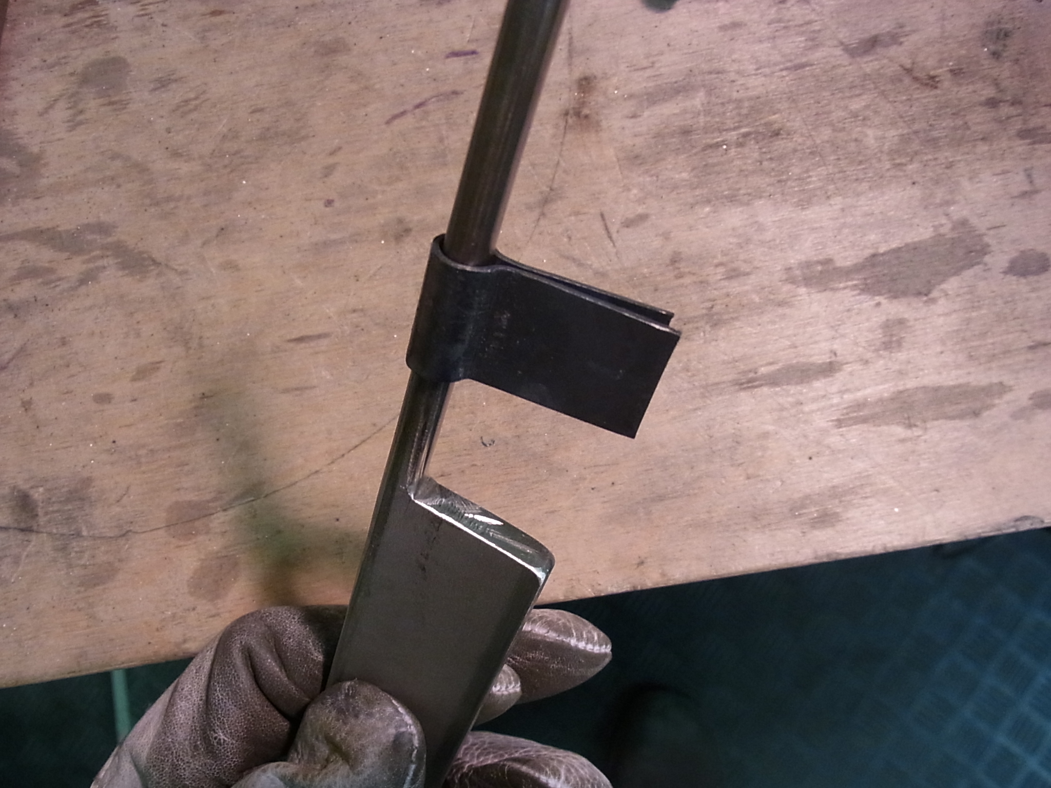 Das Schloss wird am Anfang genauso wie der Schlüssel hergestellt. Also heiß um ein Scharnierwerkzeug (6mm = Aussendurchmesser des Schlüssels) gebogen und im Schraubstock sowie mit dem Meißel nachgeformt.