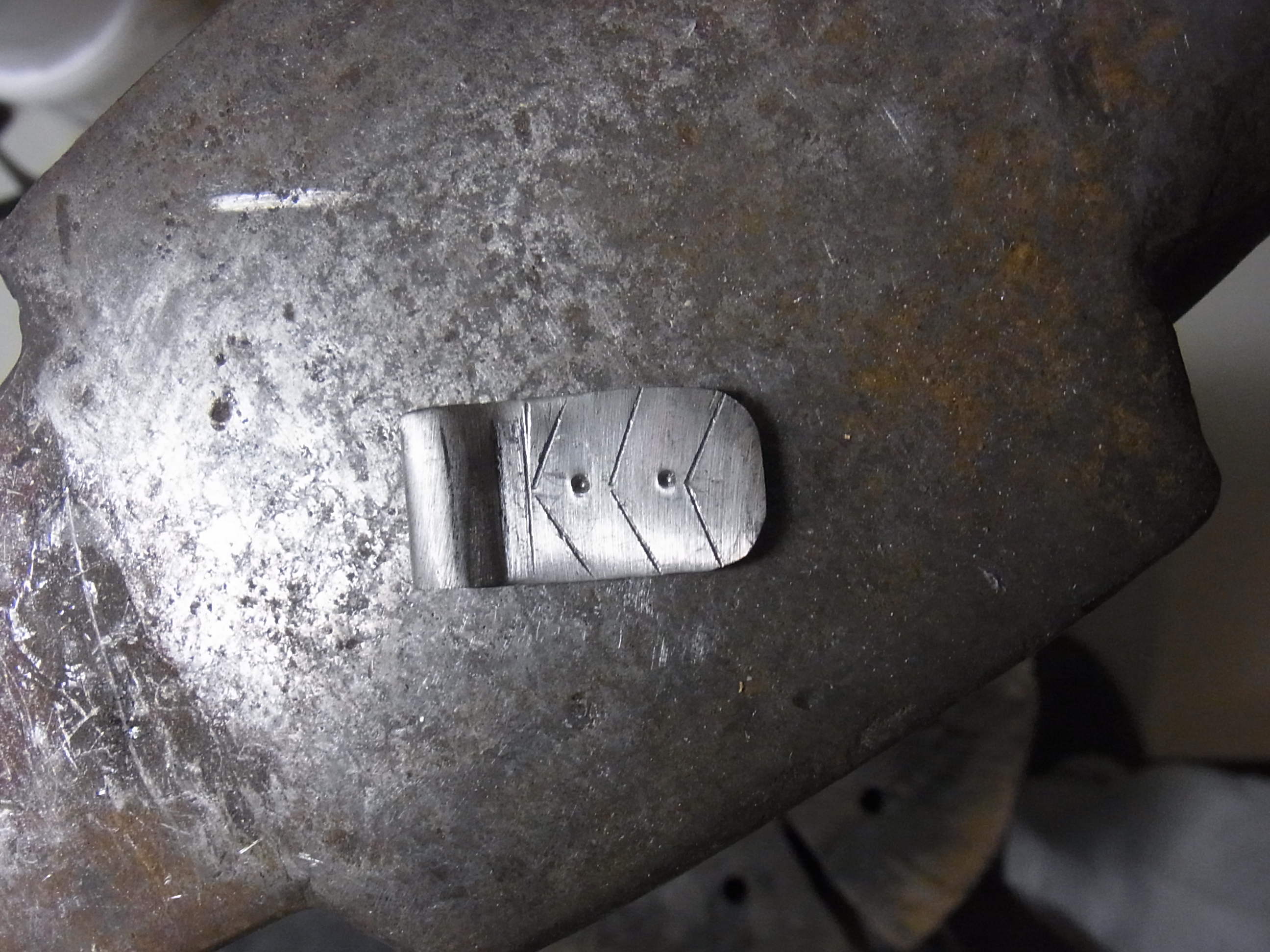 Danach meißele ich noch die Verzierungen rein (analog zum Kettenhaubenverschluß….das ist mir nicht wirklich gut gelungen. Eher hässlich als schön) und Bohre die Löcher für die Befestigungsnieten.