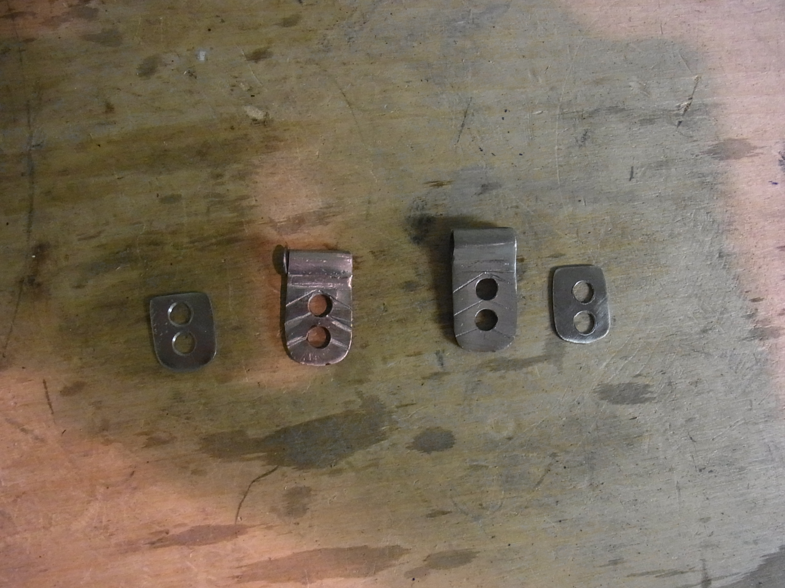 Vor dem letzten Formschritt niete ich die Flanken zusammen. Hierzu nehme ich 3mm durchmessende Stahlstifte (die knippse ich aus Nägeln). Das sind Senknietungen…das heißt die Nietlöcher sind beidseitig angesenkt. So kann ich nach dem Vernieten die Oberfläche glatt schleifen