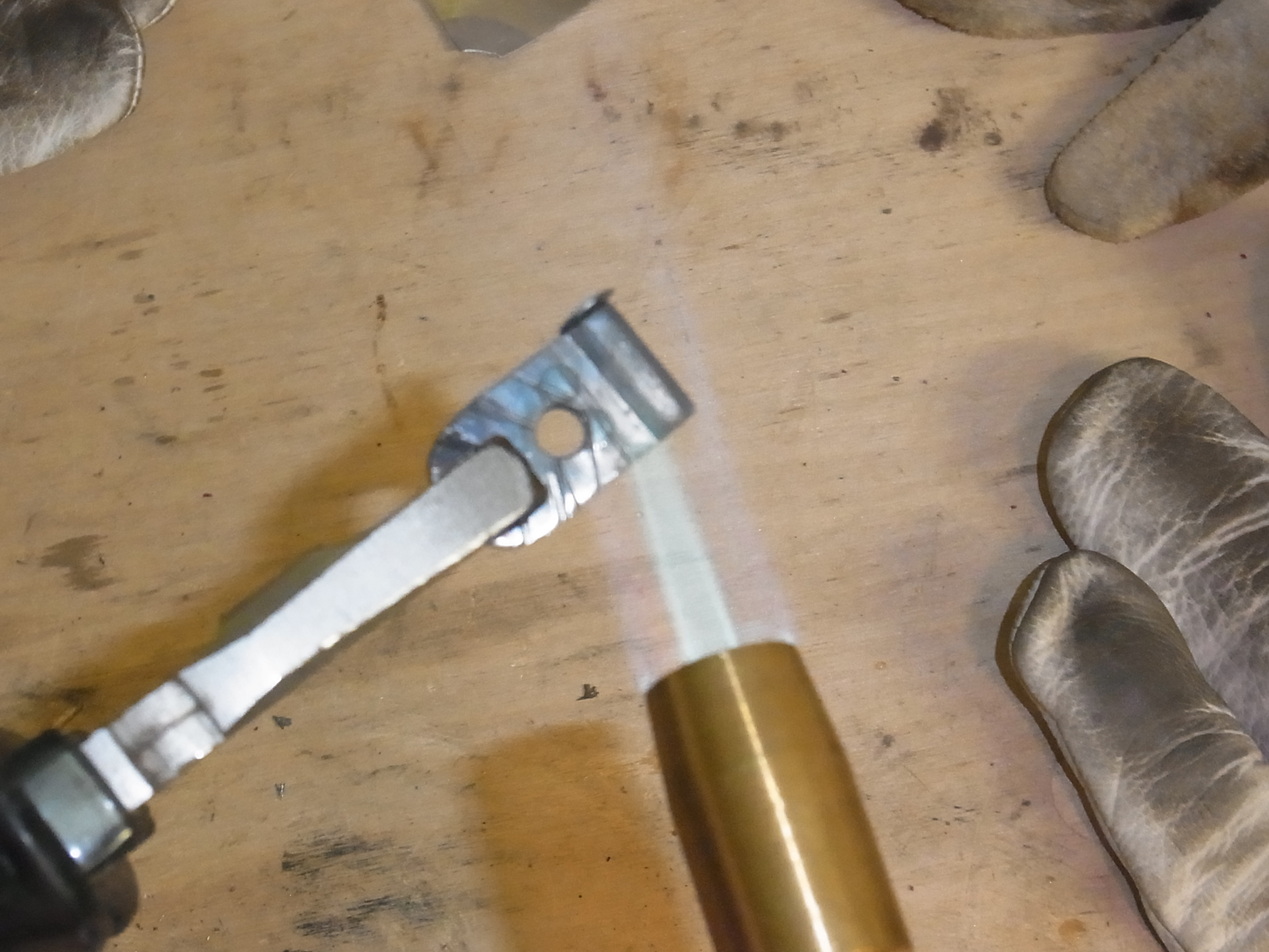 Als nächstes werden alle Teile gehärtet (glühen und in Wasser abschrecken) und angelassen (auf ca. 250°C erhitzen und langsam abkühlen lassen). Damit können die Teile sehr viele größere Kräfte übertragen. Leider hat sich dabei das Schloss verzogen so das der Schlüssel jetzt lockerer im Schloss sitzt.