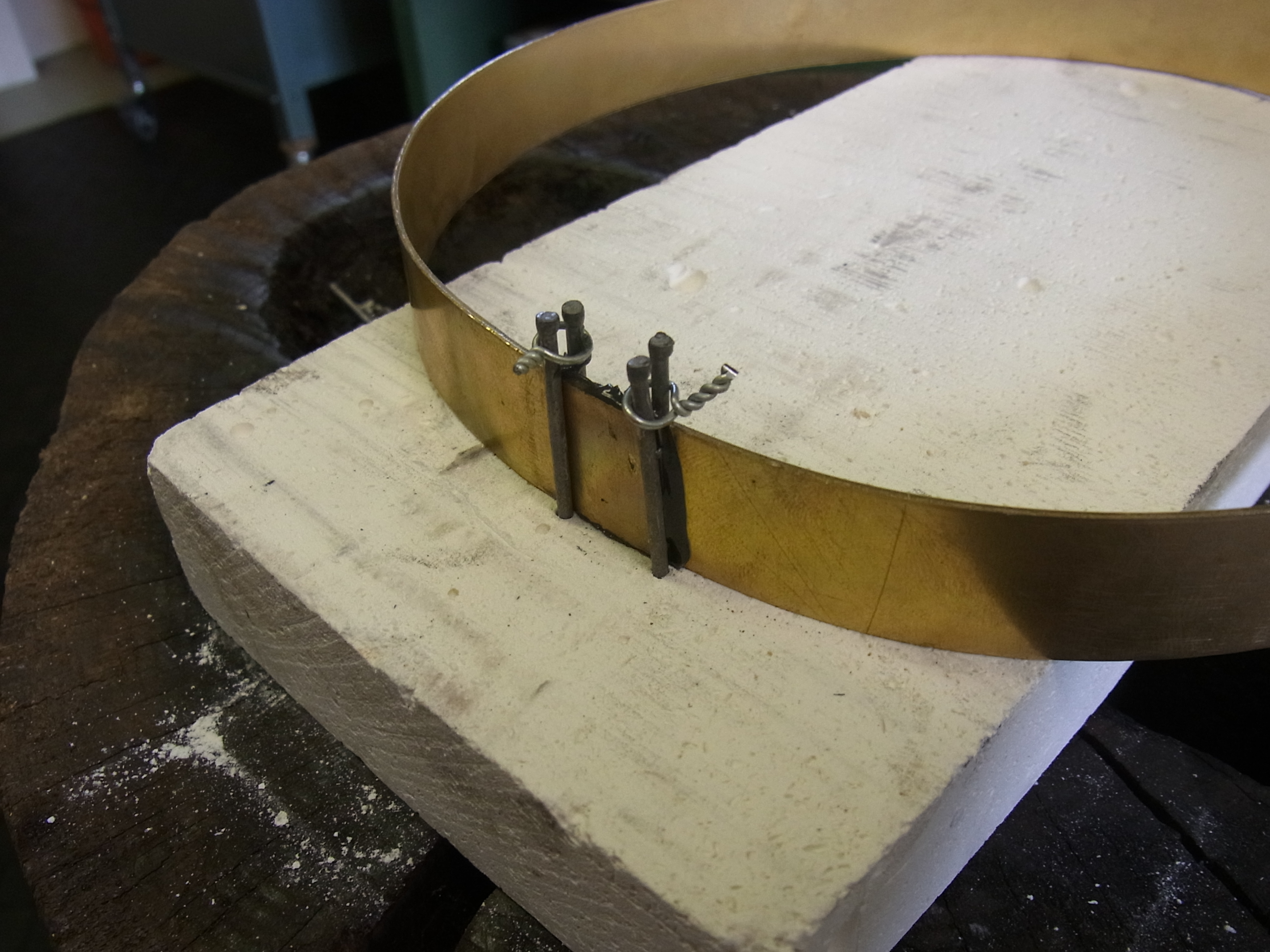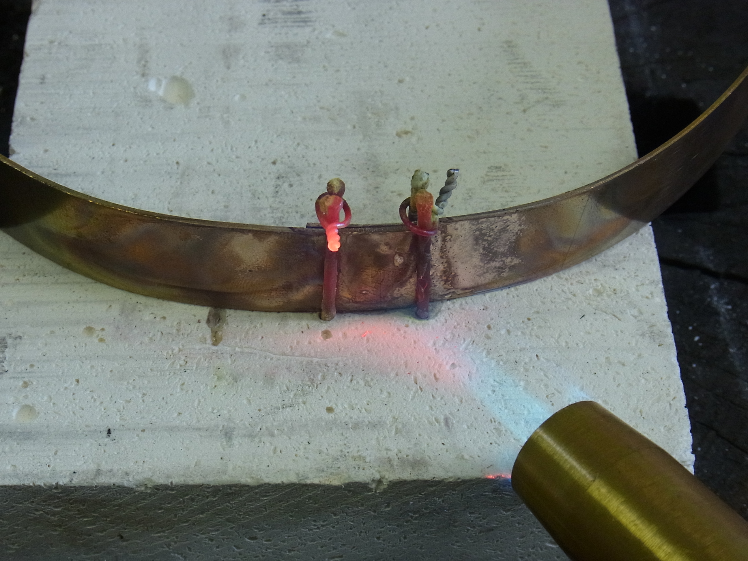 Durch eine Klemme unterstüzt befestige ich den Reif mit zusammen “geklebten” Lötflchen auf einem Lötstein. Dazu klemme ich die Lötflächen zwischen vier in den Stein eingeschlagene Nägel und zeihe die Nägel mit Draht zusammen.