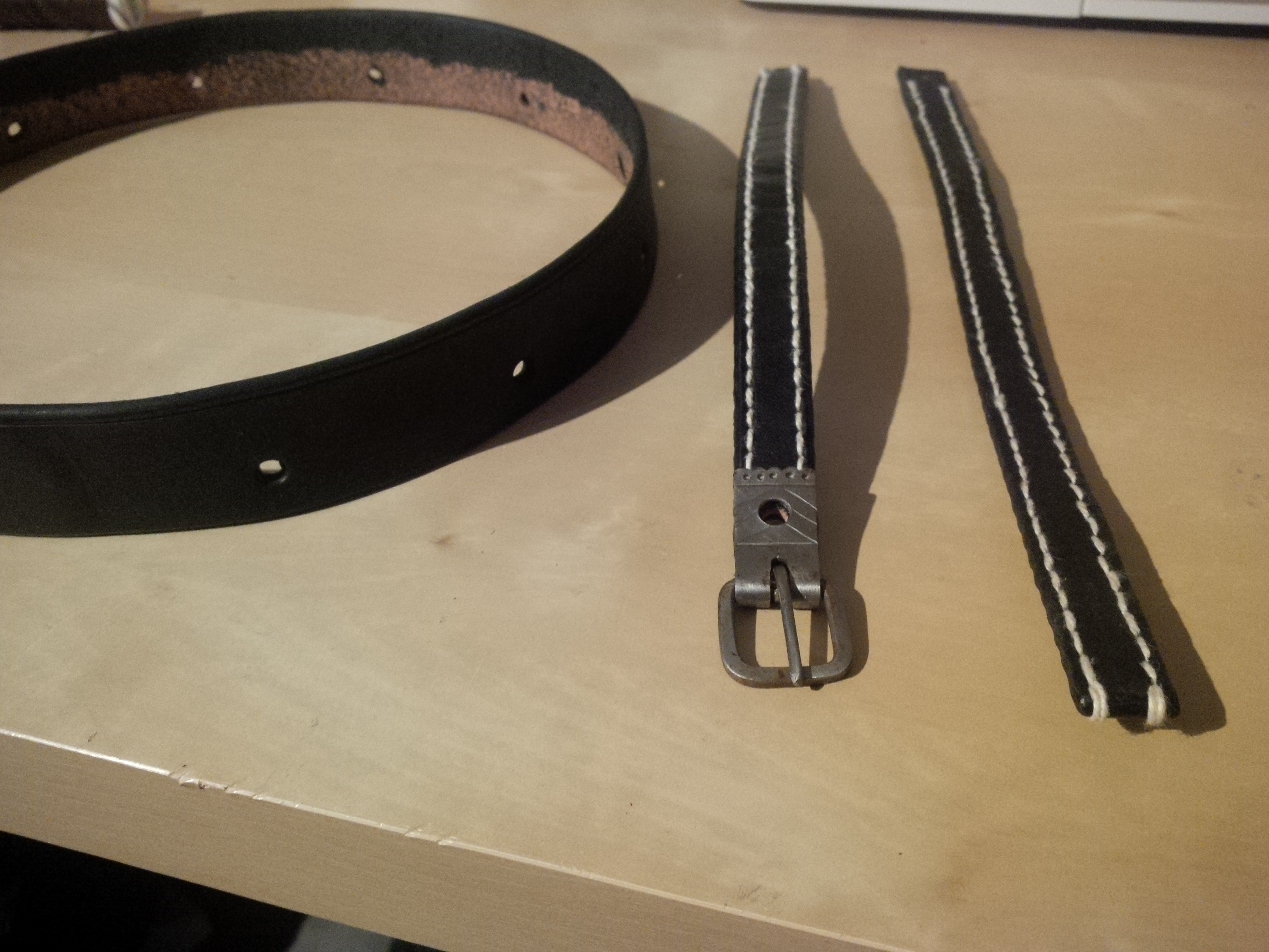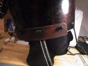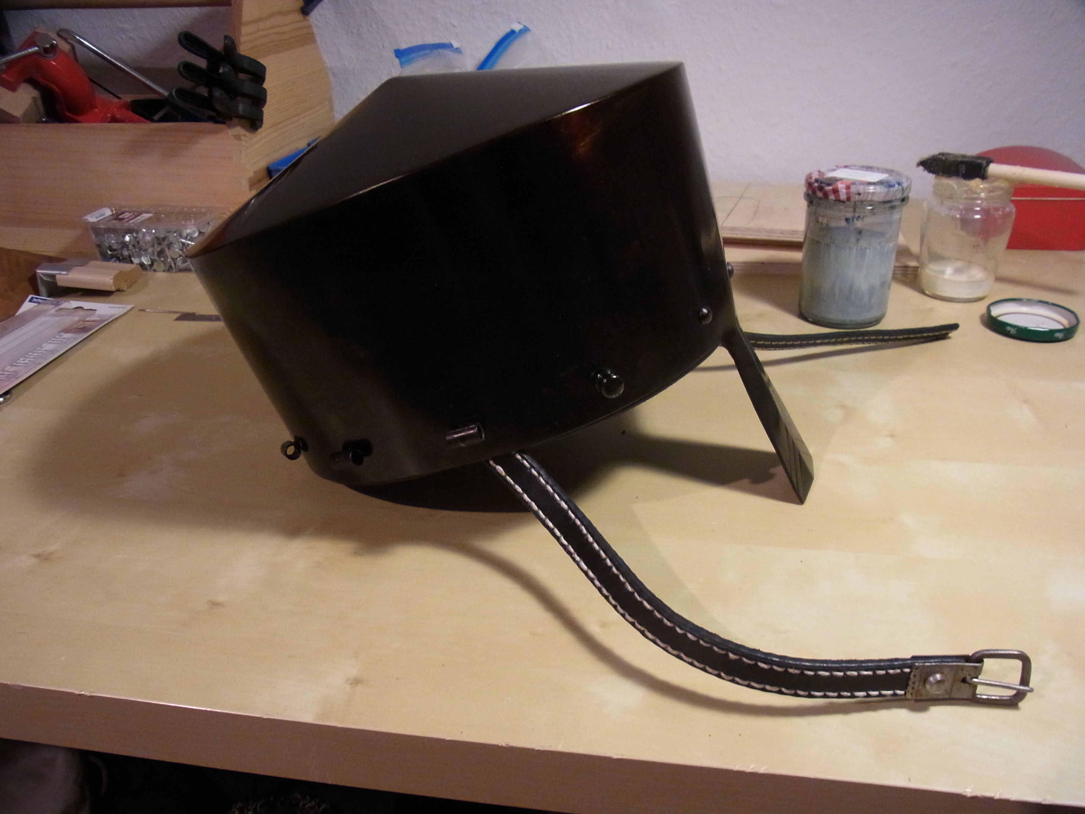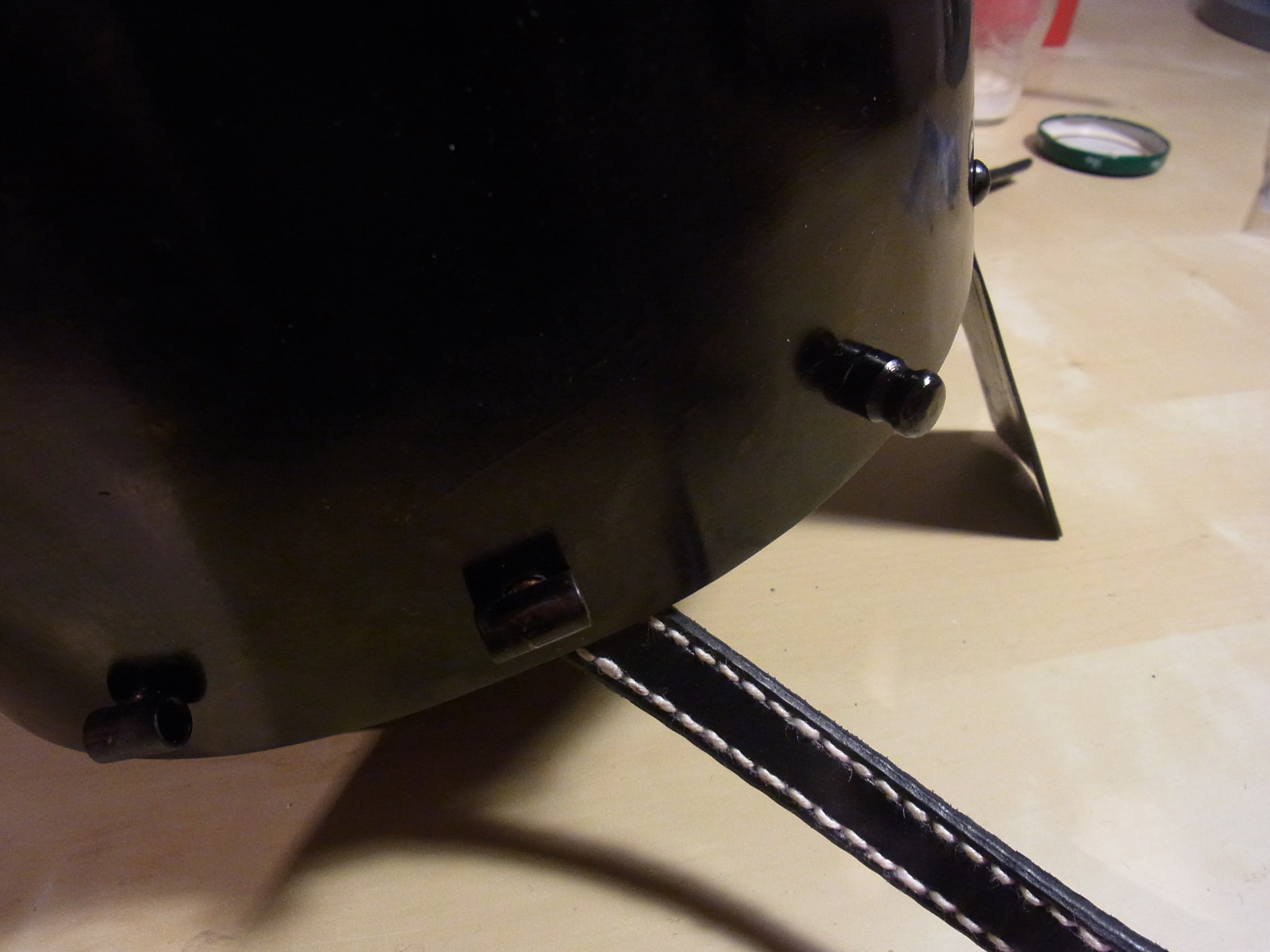The lining band is made of 4mm leather and is dyed black. For the new chinstraps I reused the buckle. The straps themself are made of 4mm leather with a sewn in inner layer of thin goatleather.