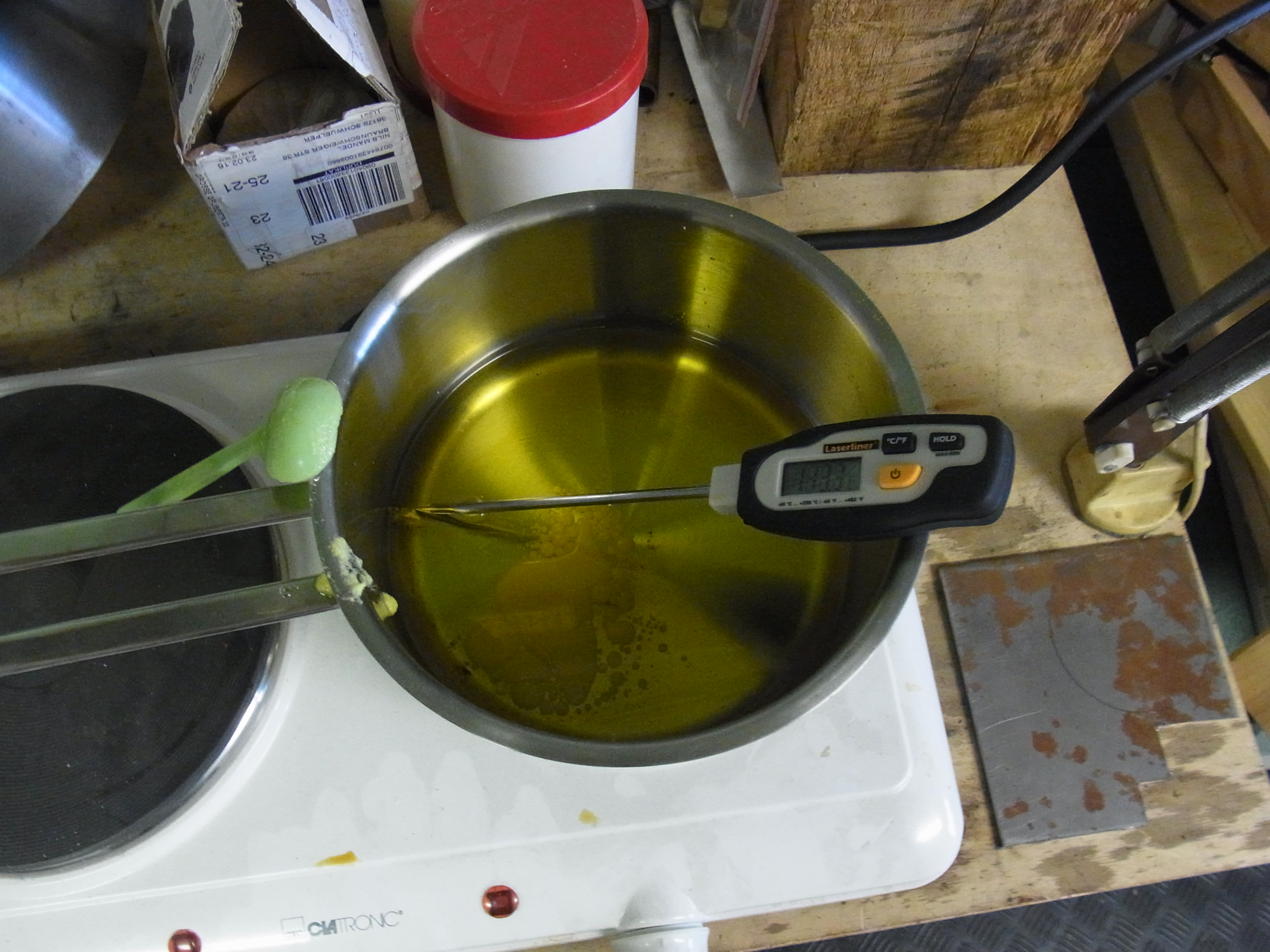 Then the linseed oil-solution is applied as a thin coat on the workpiece. There shall be no drops or schlieren on the surface. Now the workpiece is heated slowly again. First a browning should appear..