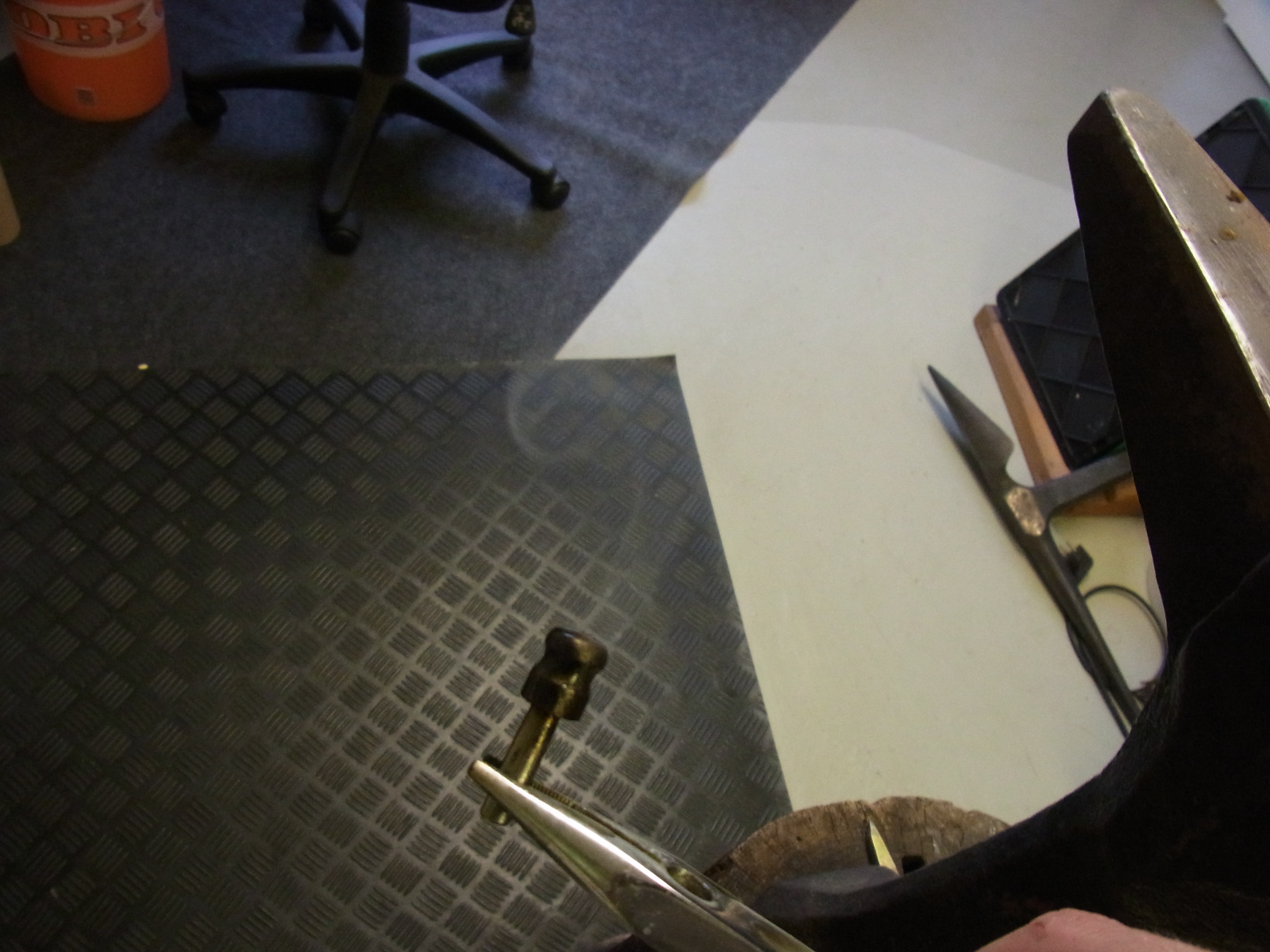Now I rivet all parts together. Important for the eyelets was to support the eyelet in a leadblock and to put a small roundbar into their holes. That prevented the eyelets from being deformed.