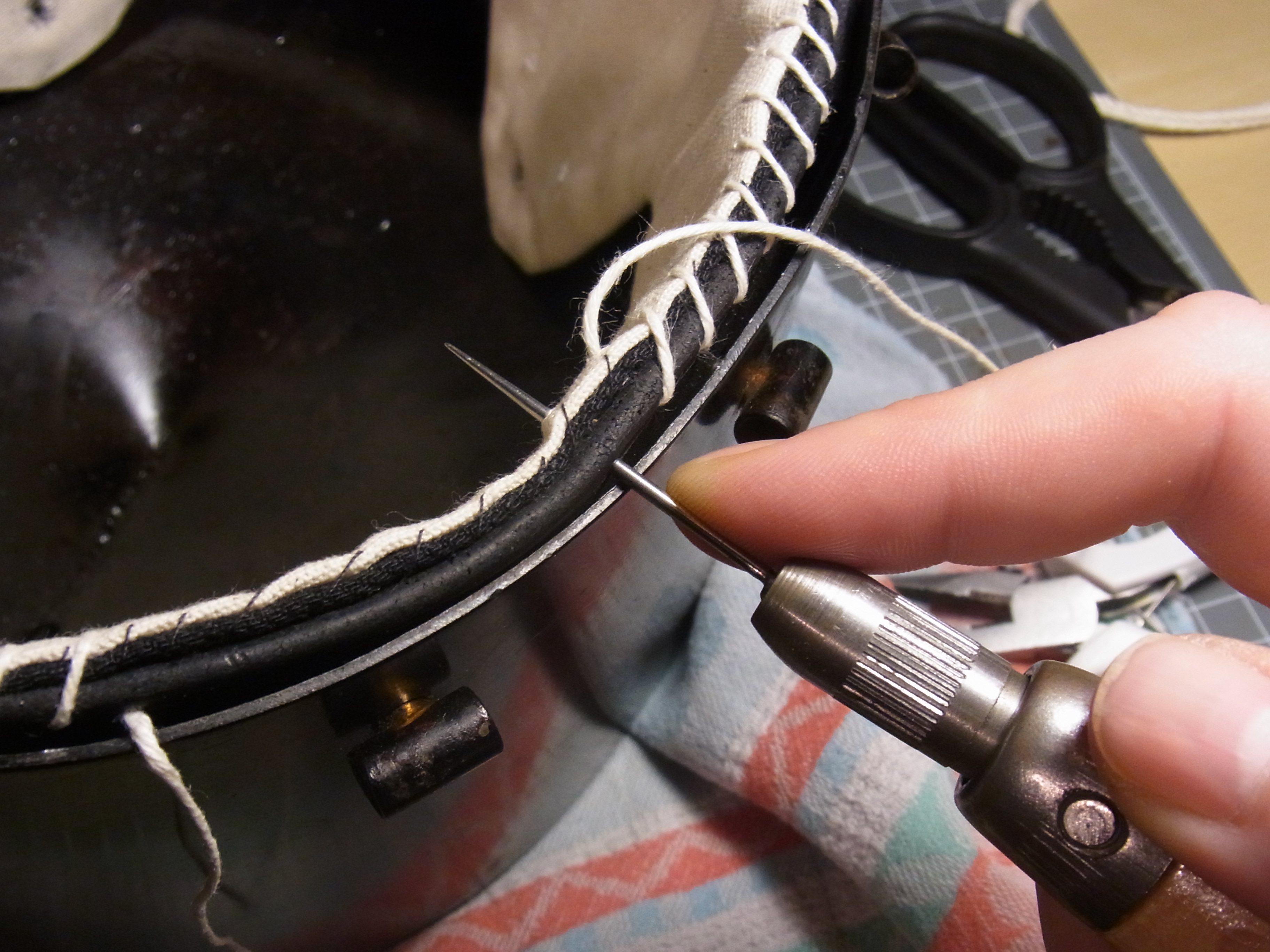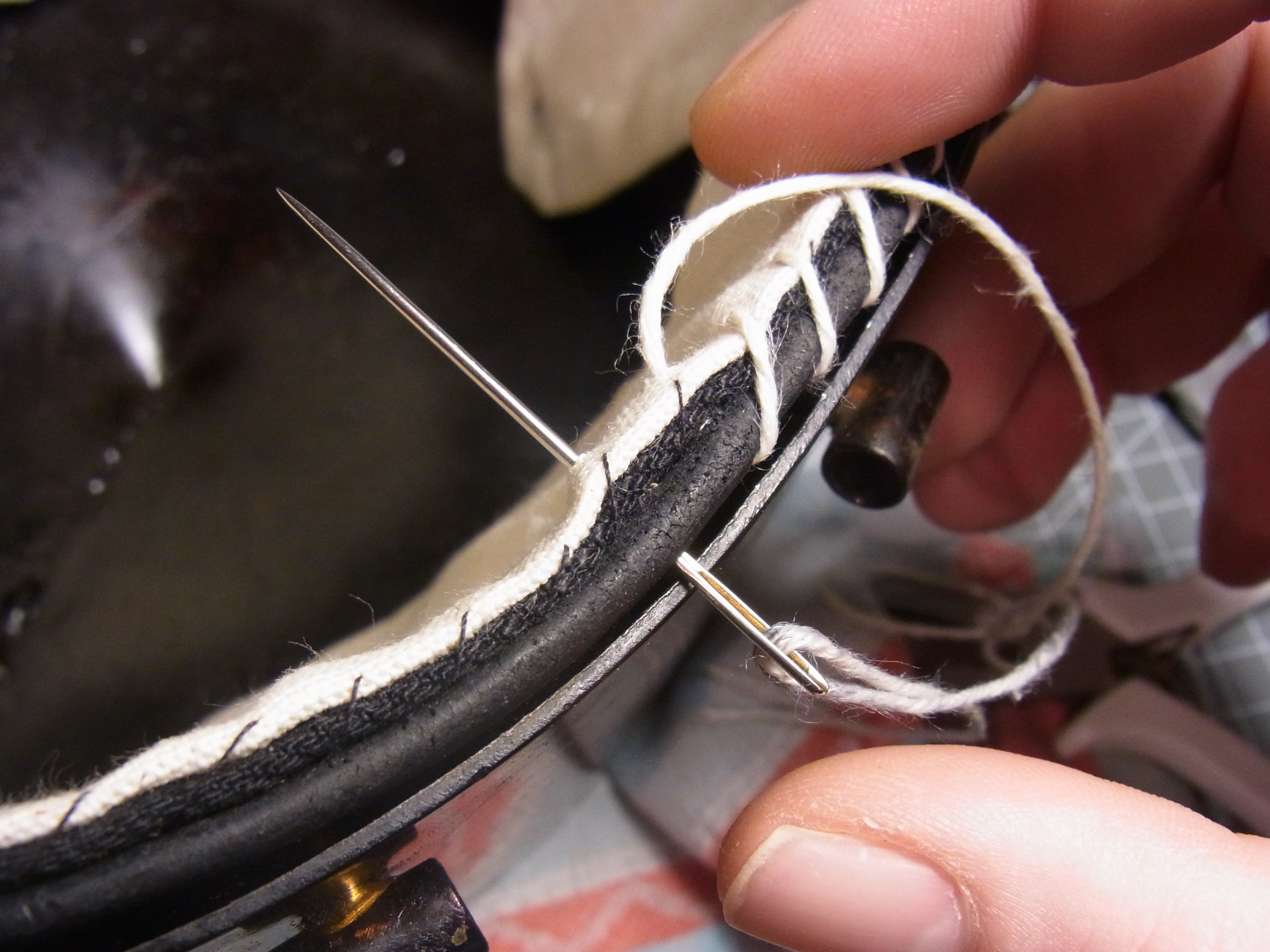 Then I saw the lining to the lining band. For this I stitch a hole every cm with an awl and sew both pieces together with a waxed linen thread.