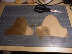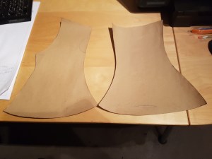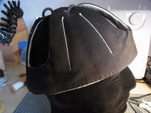 The padding is made from for pieces (two for the frontside, two for the rear). The lower edge is longer than needed and will be cut back according the chain maille aventail.