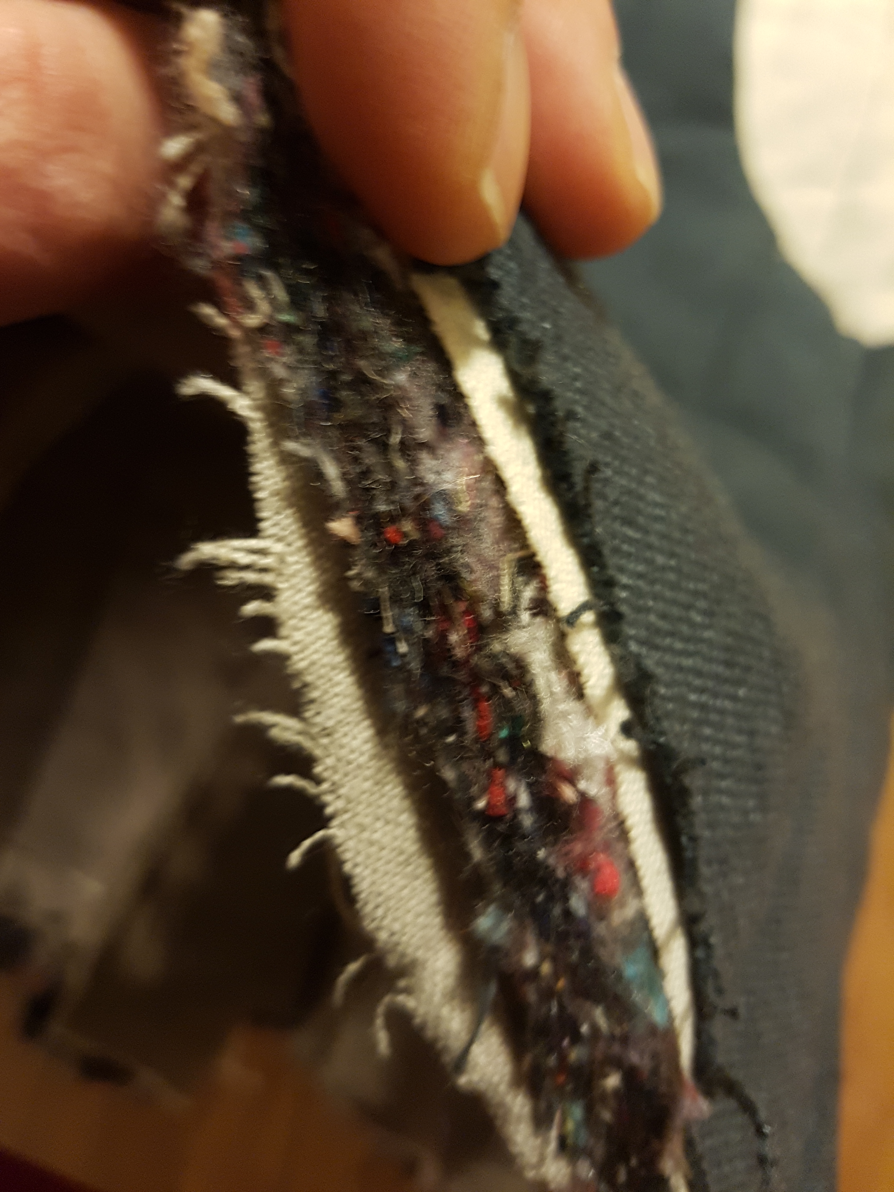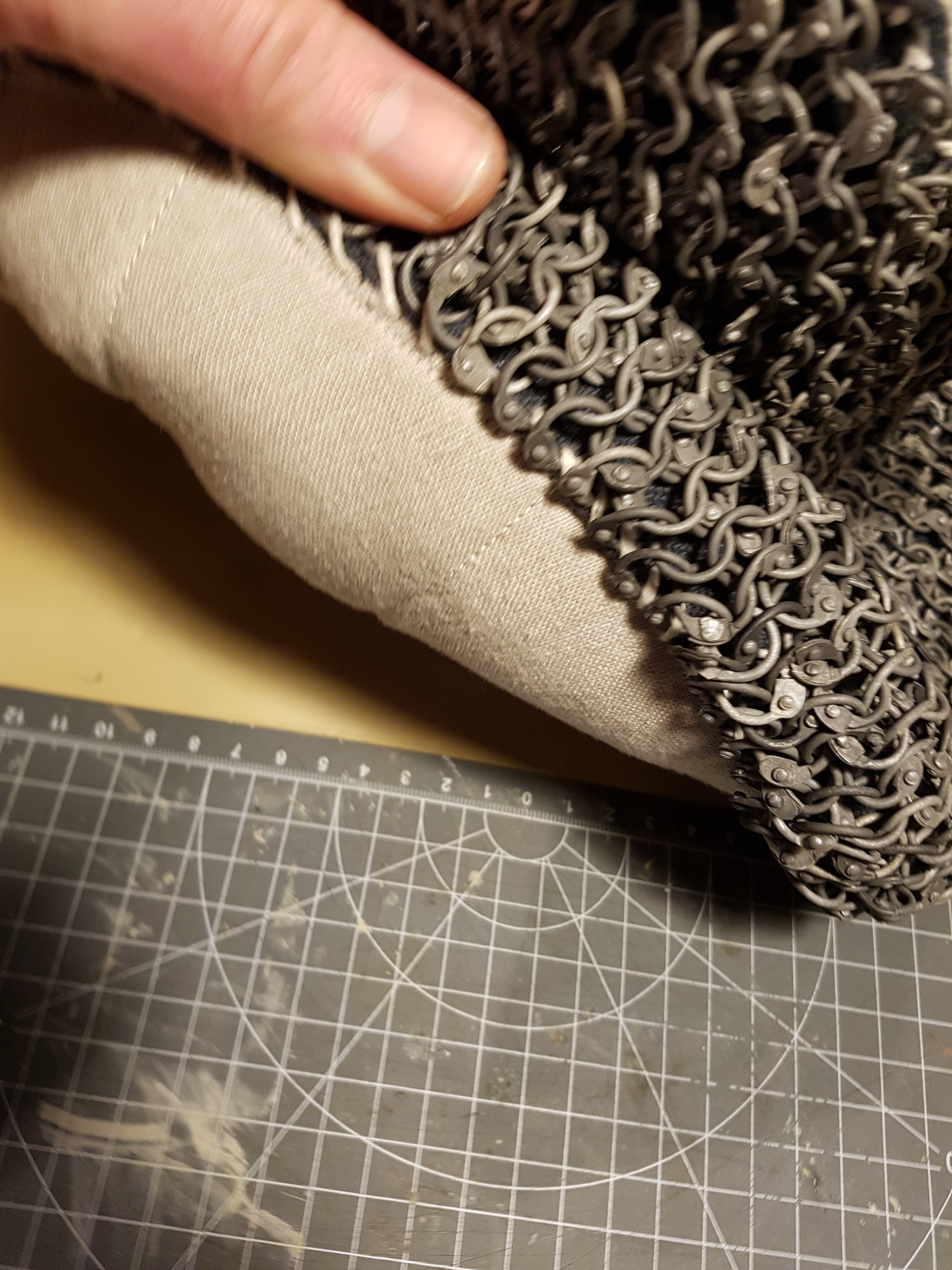 Then the loweredge is trimmed and the chainmaille is rapped around the lower corner and sewn into the inside of the padding.