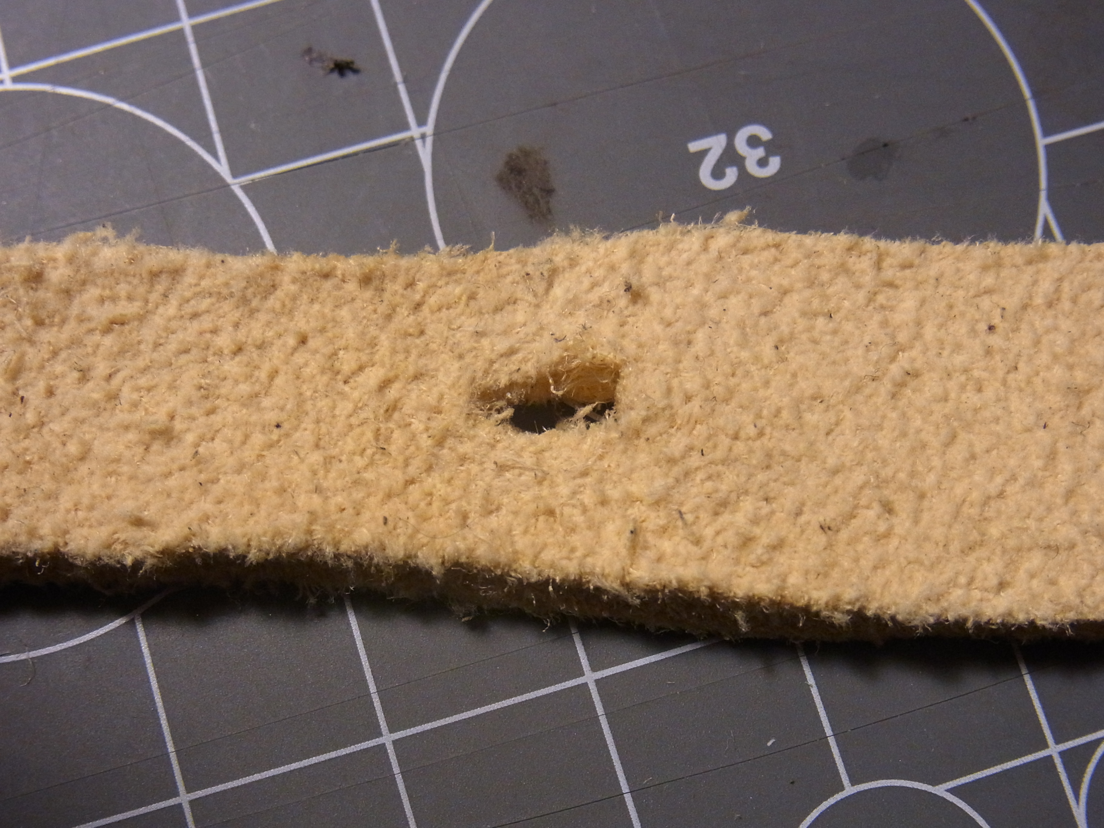 So one try should this fluffy stuff get. I cut out a 20mm broad strap (use a scissor was much easier than to cut is with a knife) and punched a 3mm hole for a buckle.