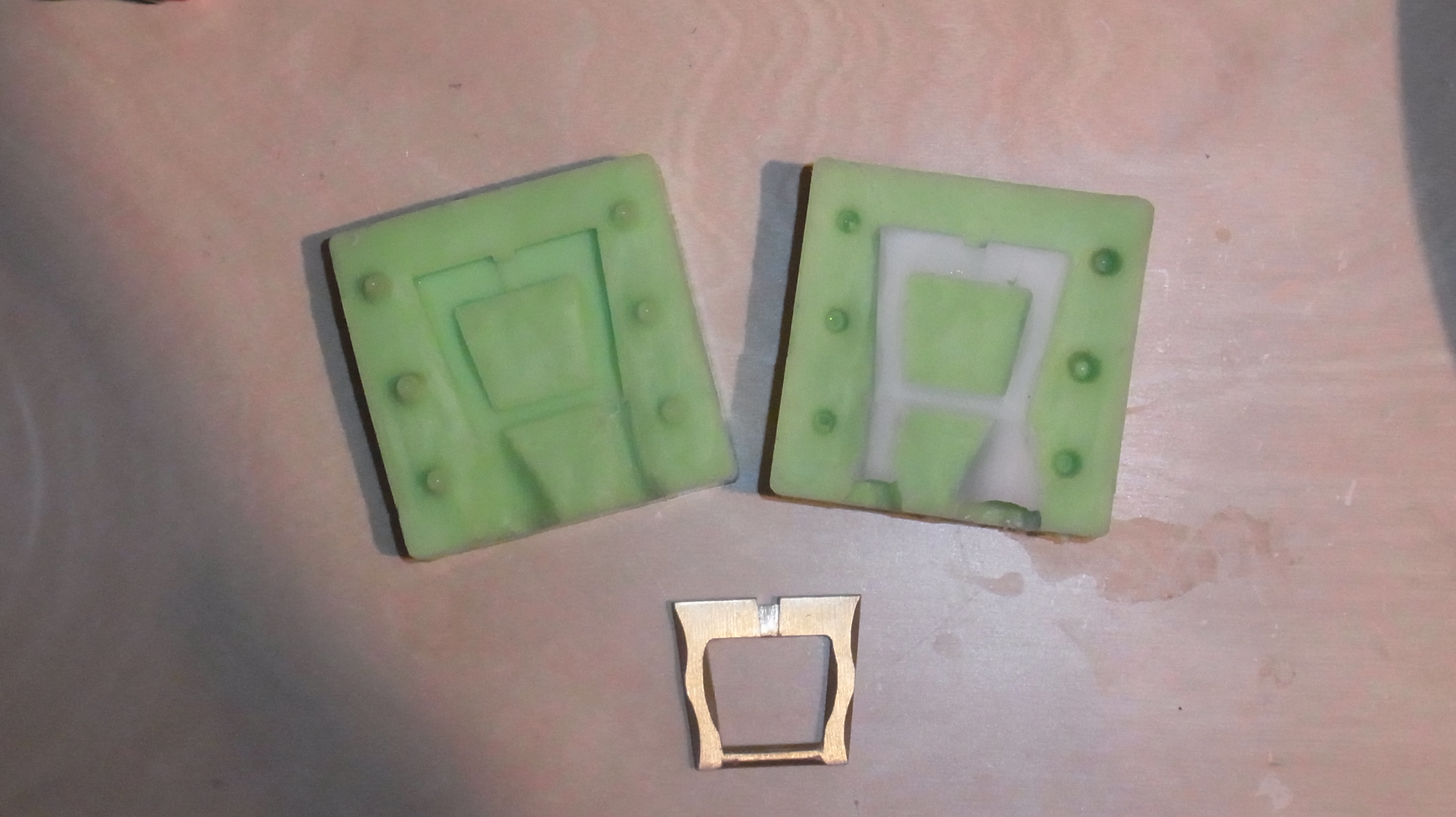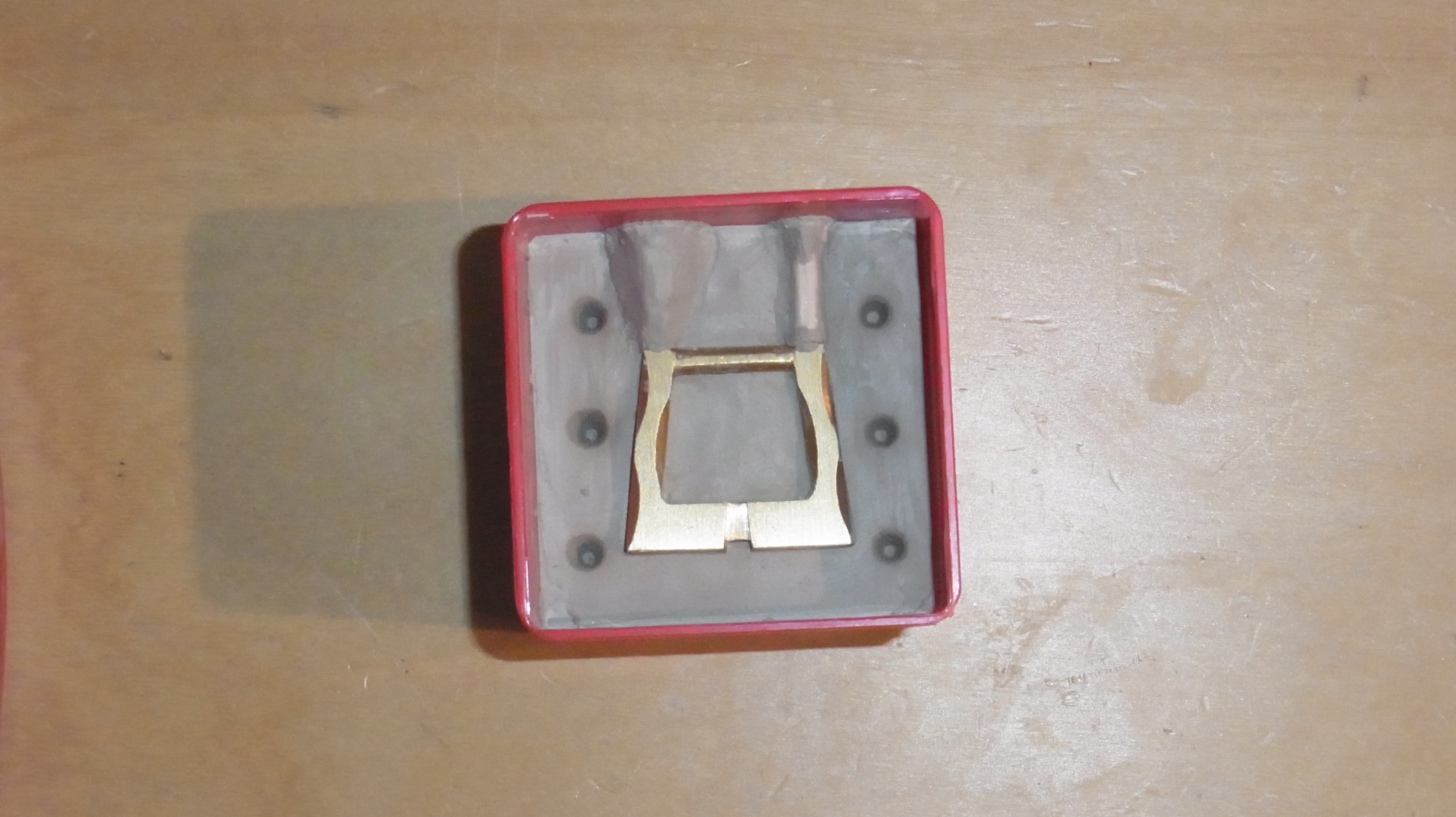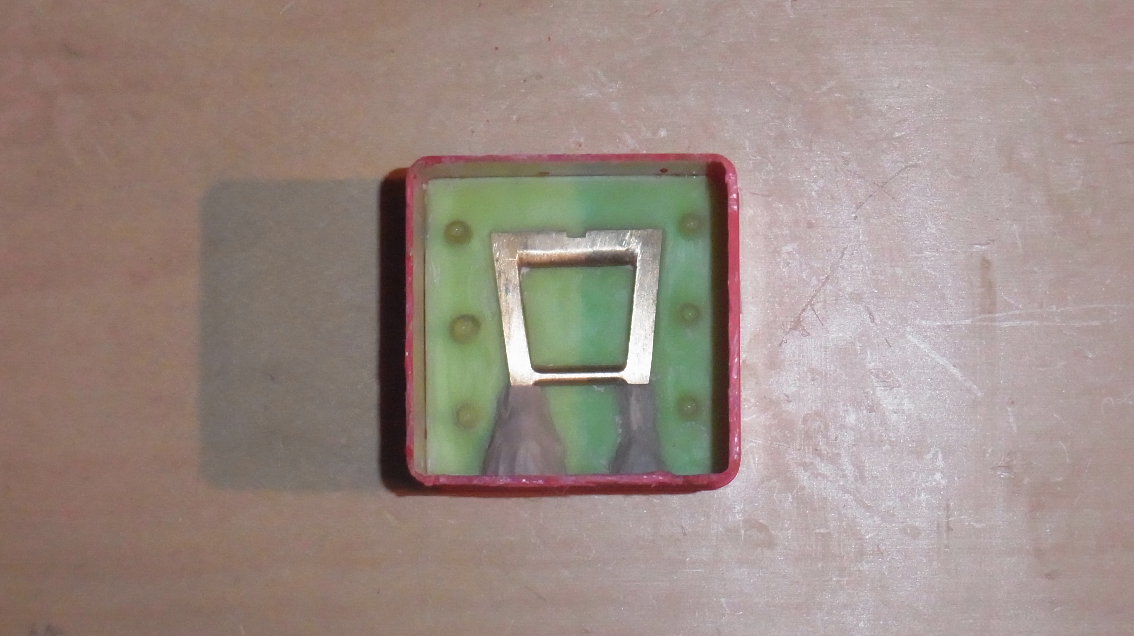 Hier fertige ich einen Abguß einer angefertigten Messing Schnalle um sie später kopieren zu können. Mit der Form möchte ich dann Wachs-Kopien abgießen die ich später zur Erstellung der Messinggußform nutze.