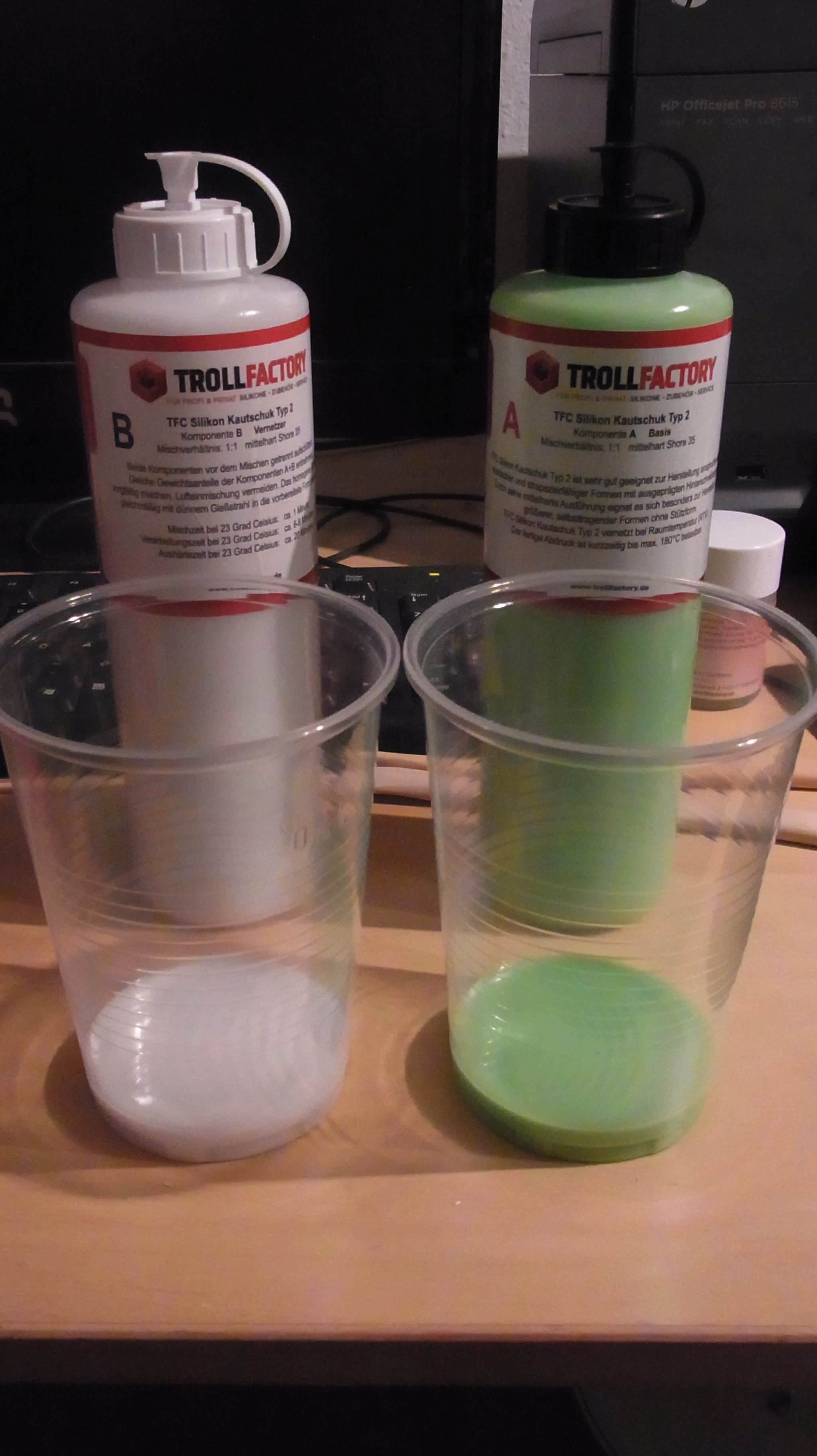 Normalerweise müsste das Silikon nach dem Mischen in einer Vakuumkammer von der eingeschlossenen Luft befreit werden. Bei kleinen Mengen kann man das Silikon auch aus großer Höhe im feinen Strahl in die Form gießen. Dabei zerplatzen ne Menge von den Luftbläschen.