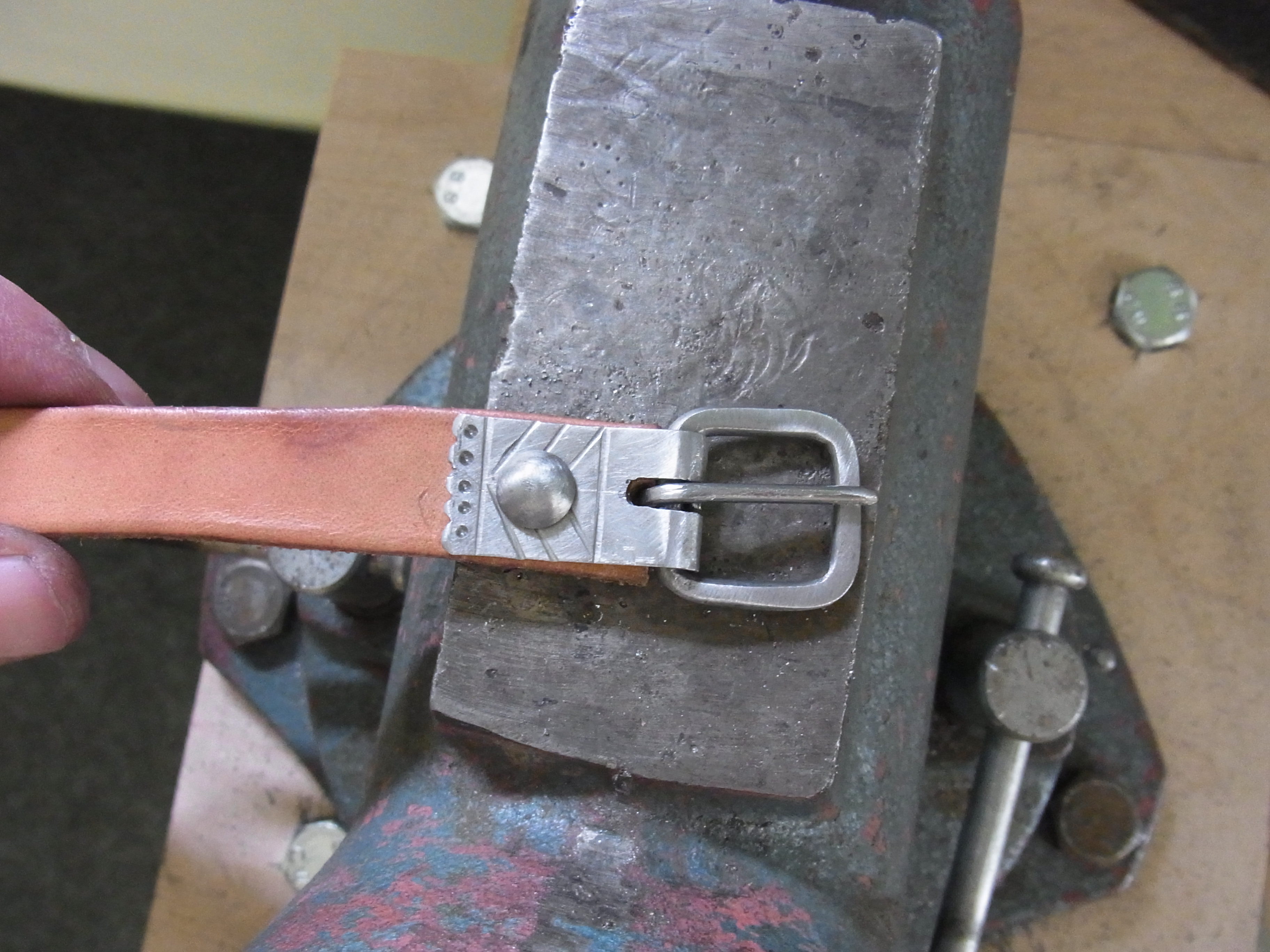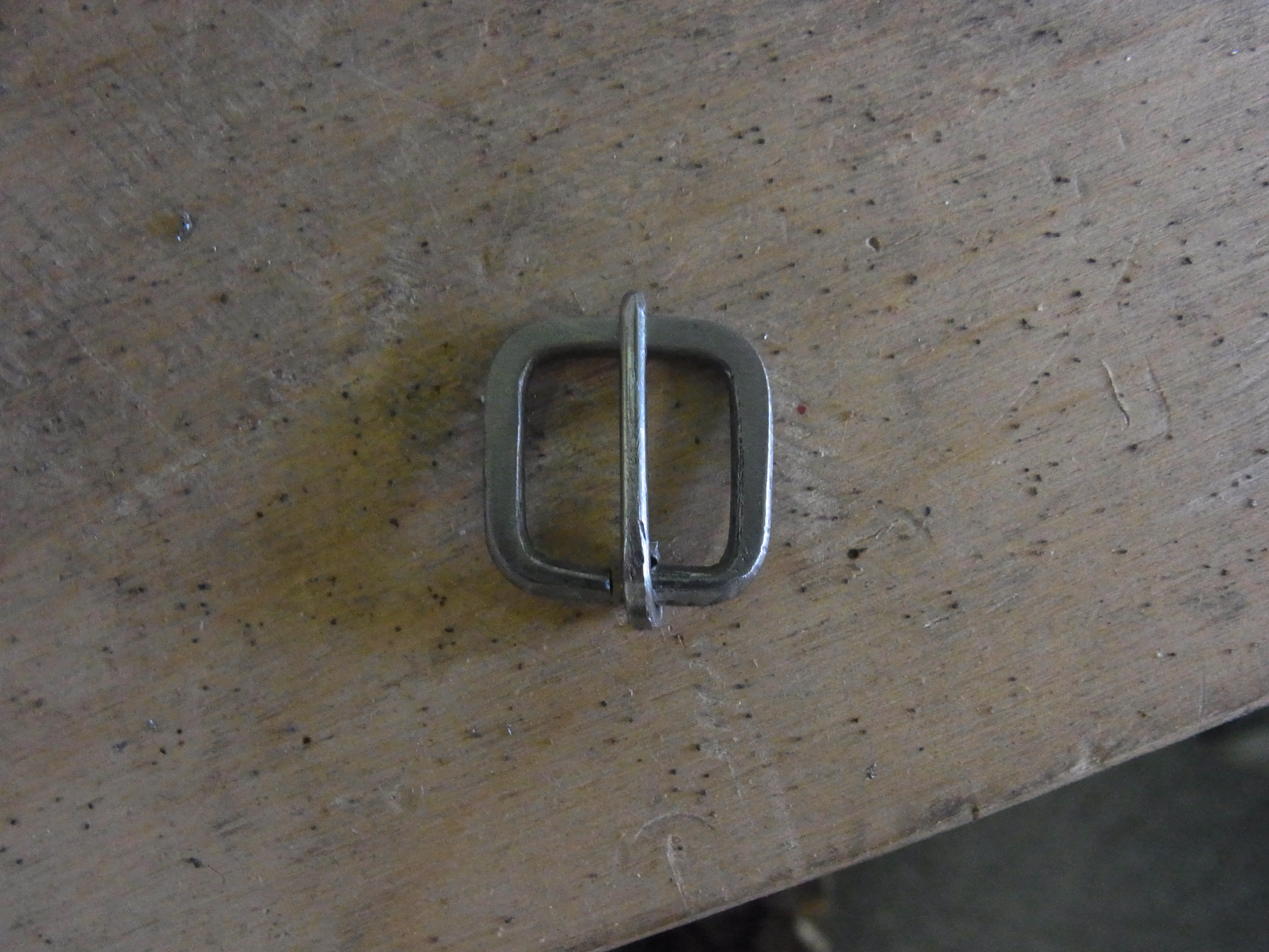 Gebogene Schnallen mache ich meistens aus Nägeln. Nach dem Kopf abgesägt ist kann man die Bügelform recht einfach im Schraubstock biegen.