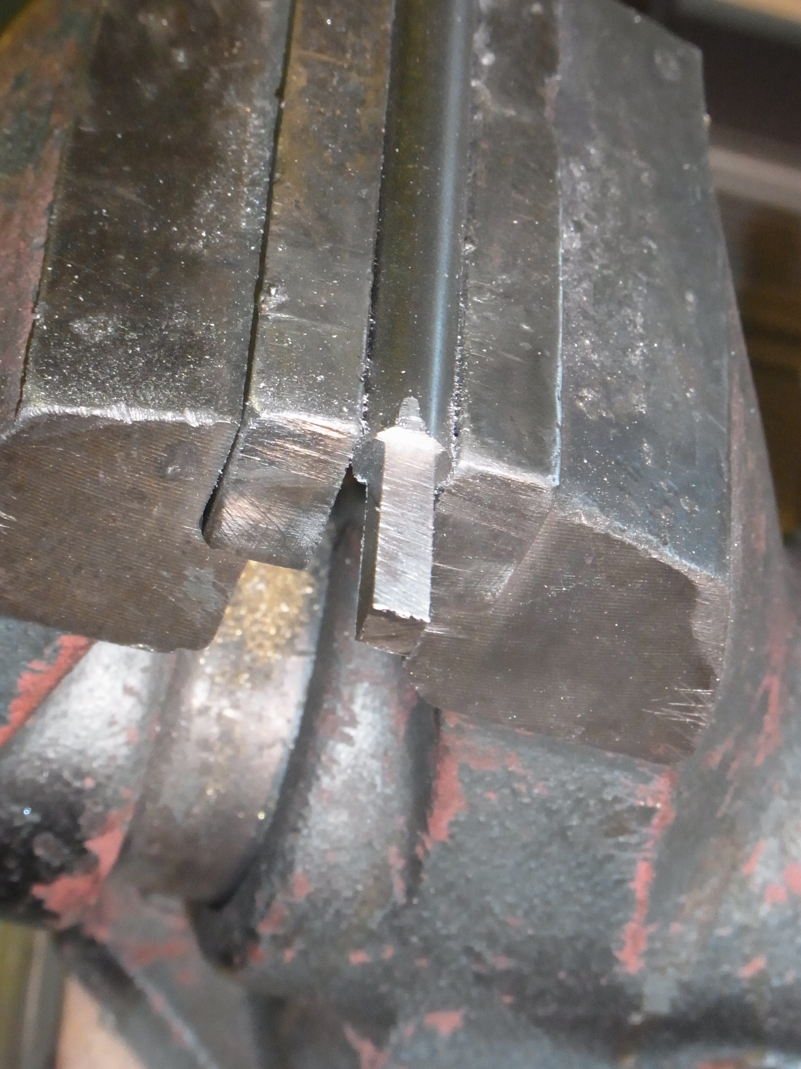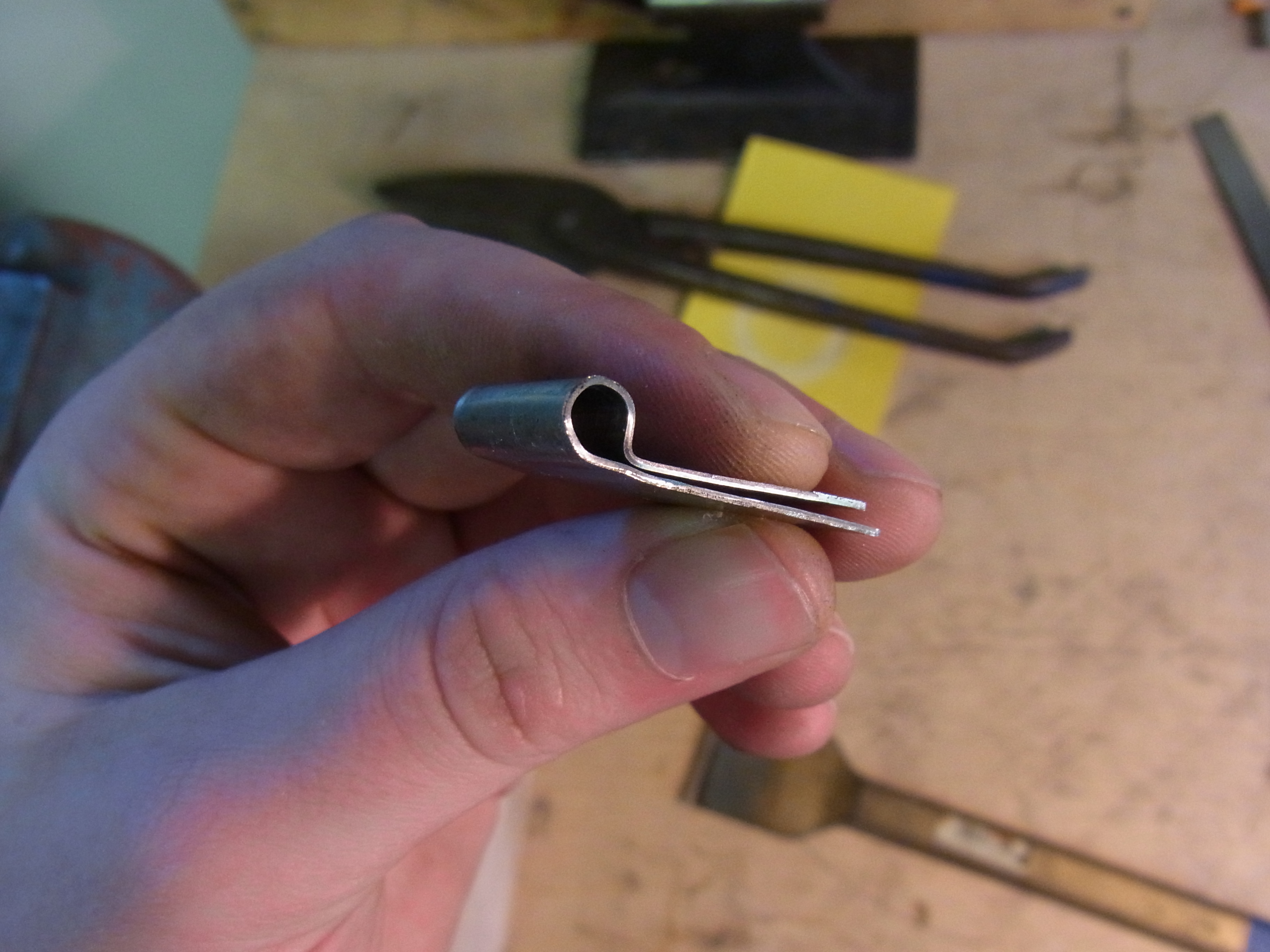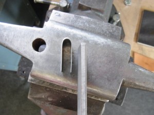 Das Blech “U” wird auf den Dorn des Werkzeuges gezogen und die freien Schenkel werden im Schraubstock zusammengequetscht.