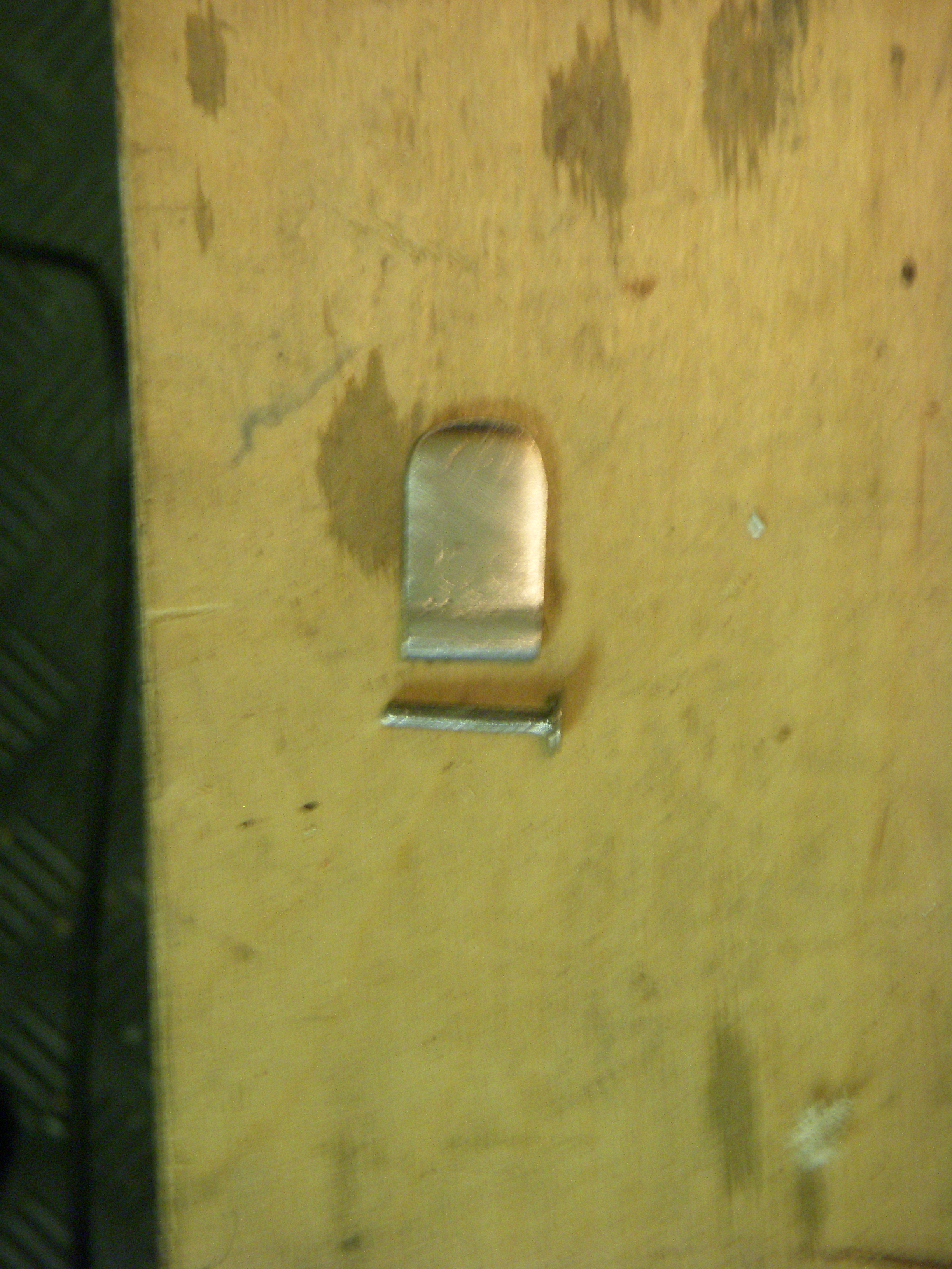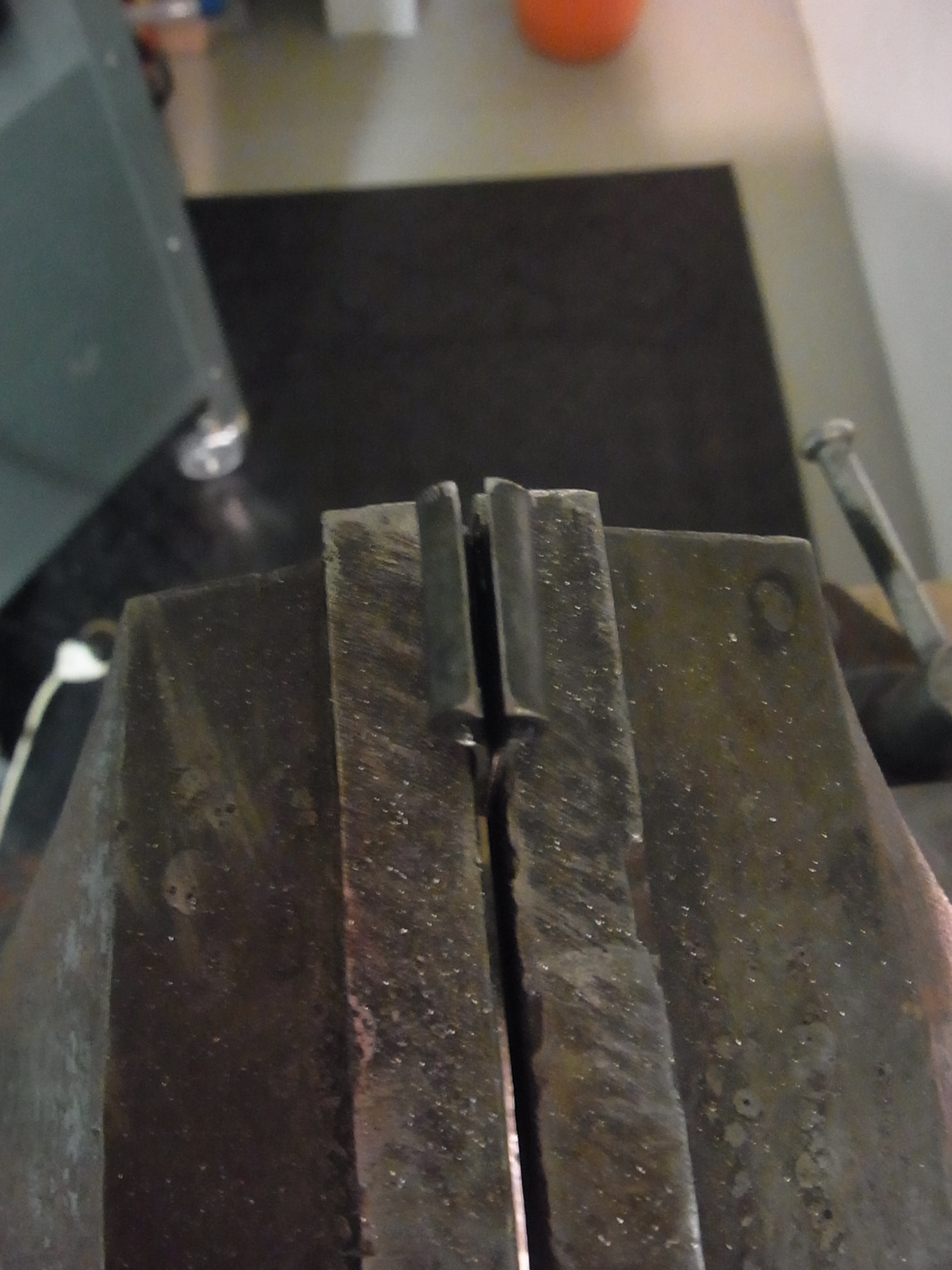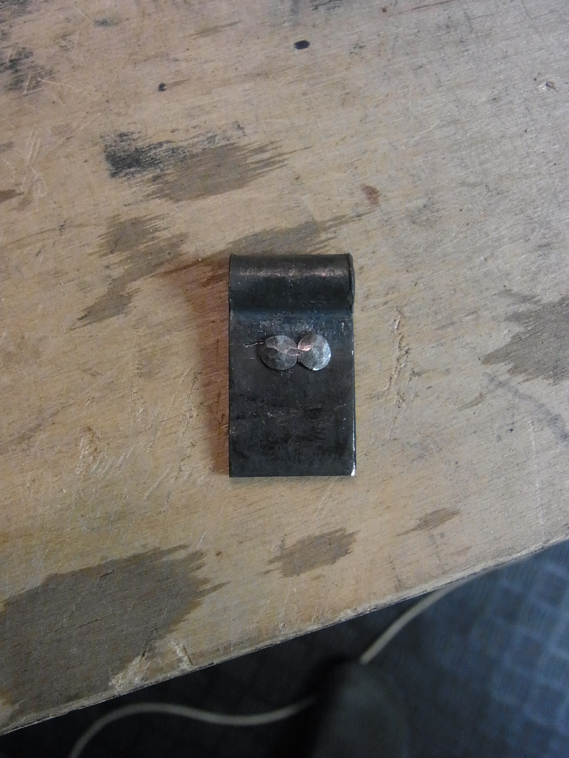 Vor dem letzten Formschritt niete ich die Flanken zusammen. Hierzu nehme ich 3mm durchmessende Stahlstifte (die knippse ich aus Nägeln). Das sind Senknietungen…das heißt die Nietlöcher sind beidseitig angesenkt. So kann ich nach dem Vernieten die Oberfläche glatt schleifen