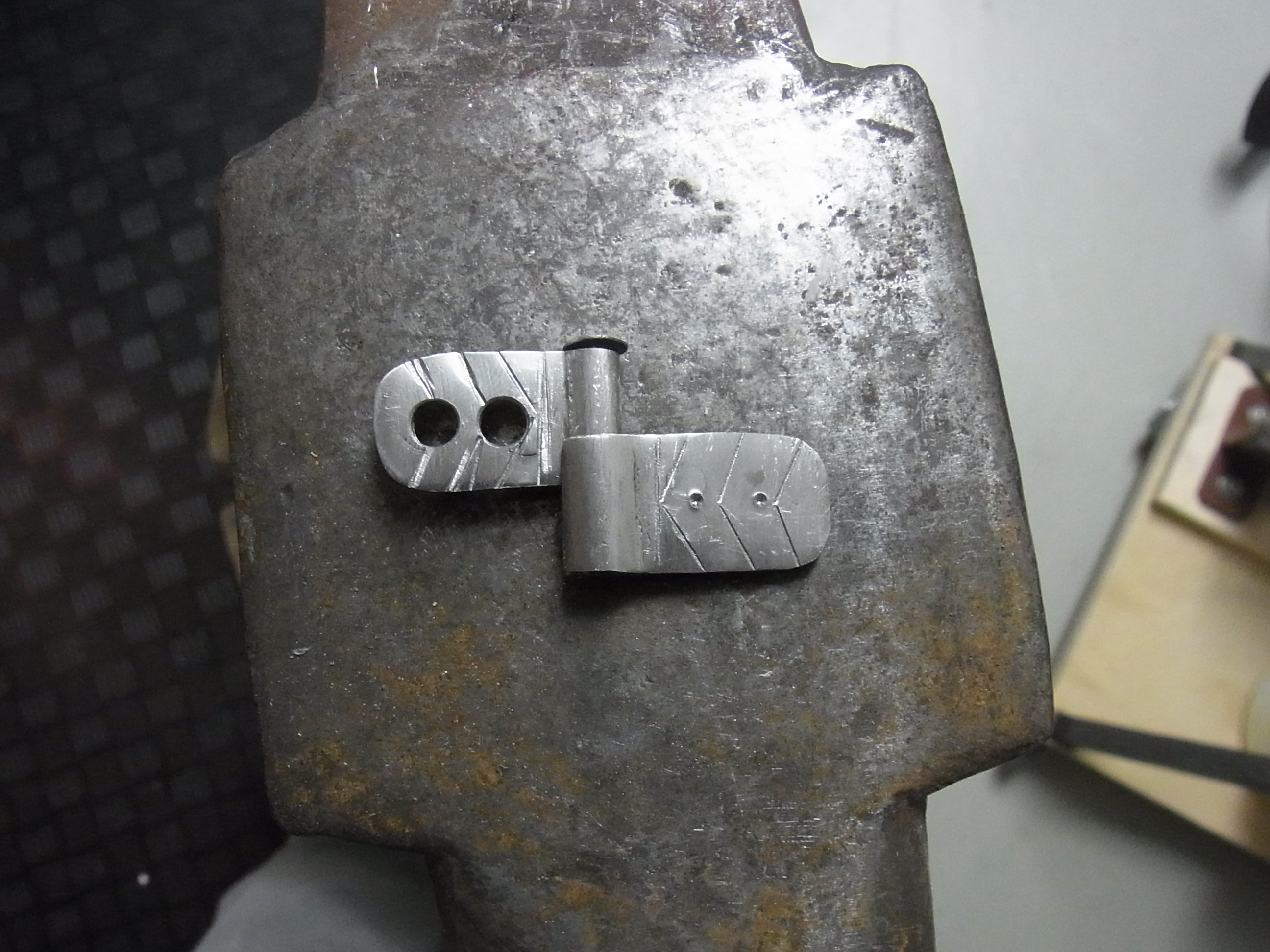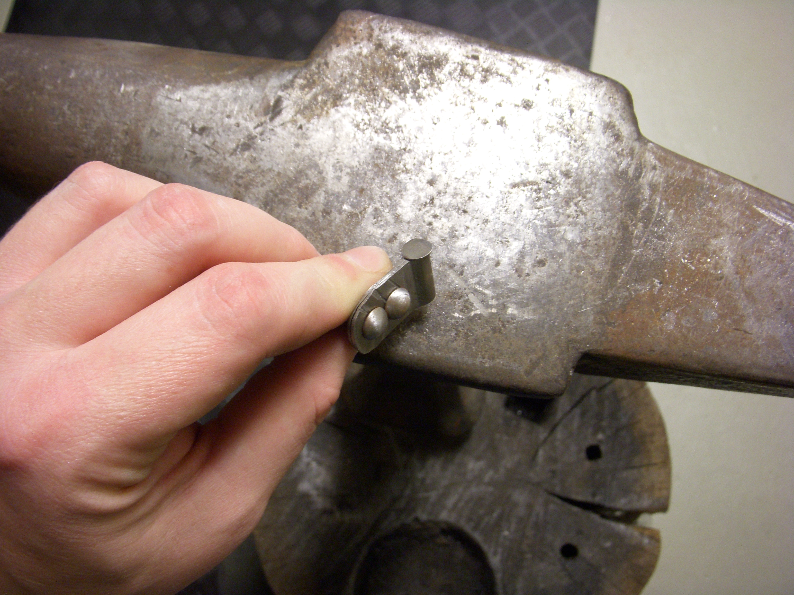 Will man das ganze auf einen Lederriemen Nieten ist man mit dem Grobformen jetzt schon fertig. Soll es direkt auf das Rüstungsteil genietet werden geht es mit dem Scharnierwerkzeug am Schraubstock weiter.
