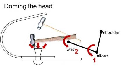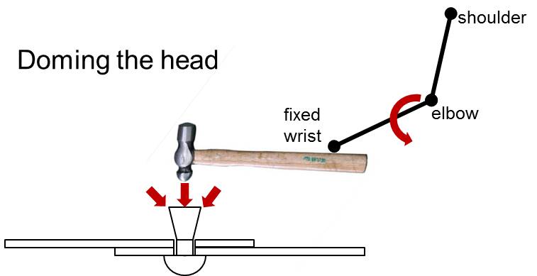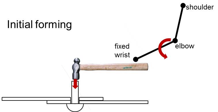 I lower the elbow till the path of the swinging hammer will reach into the workpiece. Than by swinging the hammer with the elbow (1) the hammer collects impuls and in the last moment I rotate the hammer around my wrist to hit the rivet in the correct angle.
