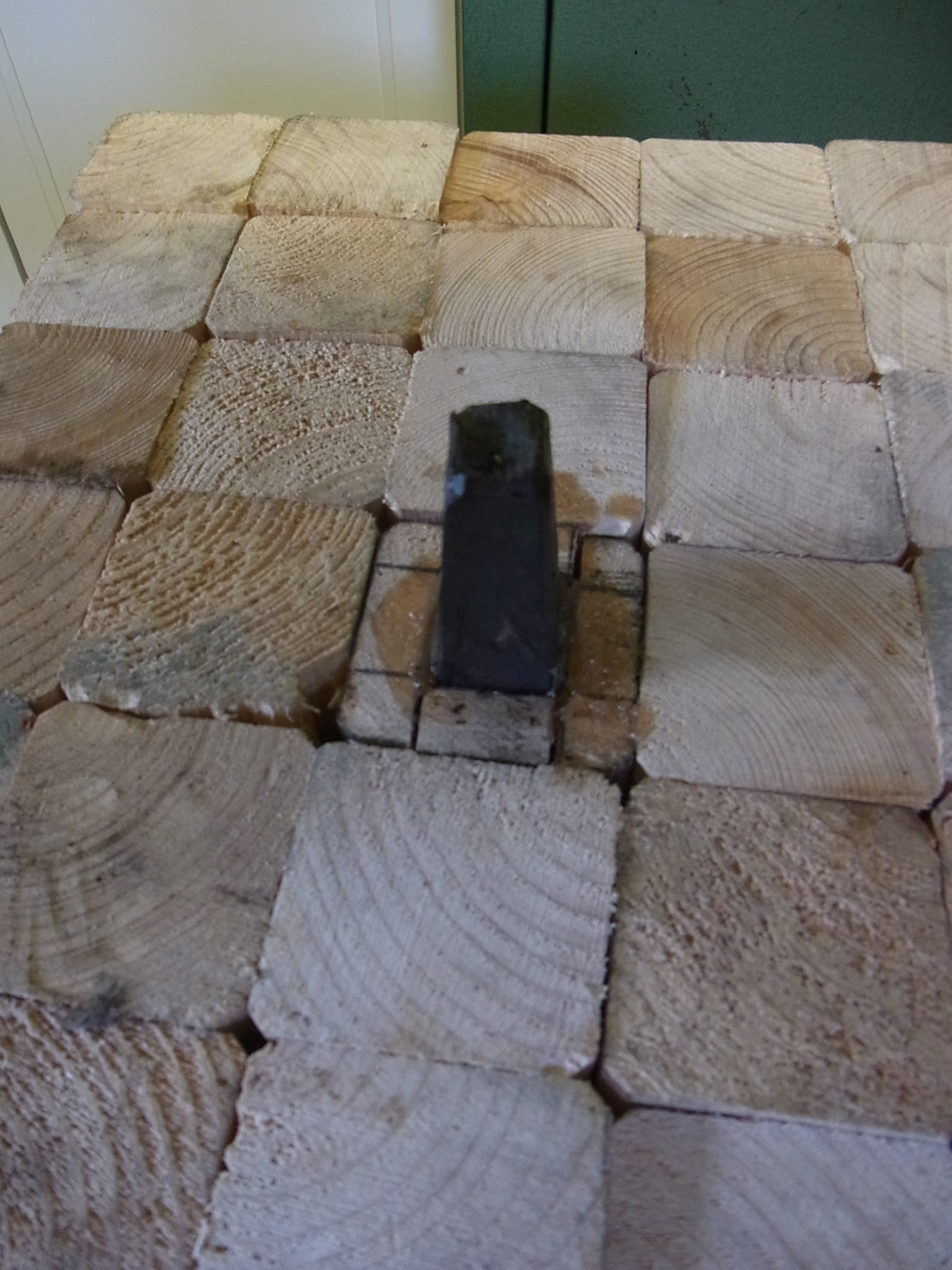 Der Haltedorn ist ein zurechtgeschmiedeter 30x30mm Vierkantstahl. Ich passe ihn in die Mitte des Holzklotzes ein und keile das ganze nach ner ordentlichen Behandlung mit Maschinenfett ein.