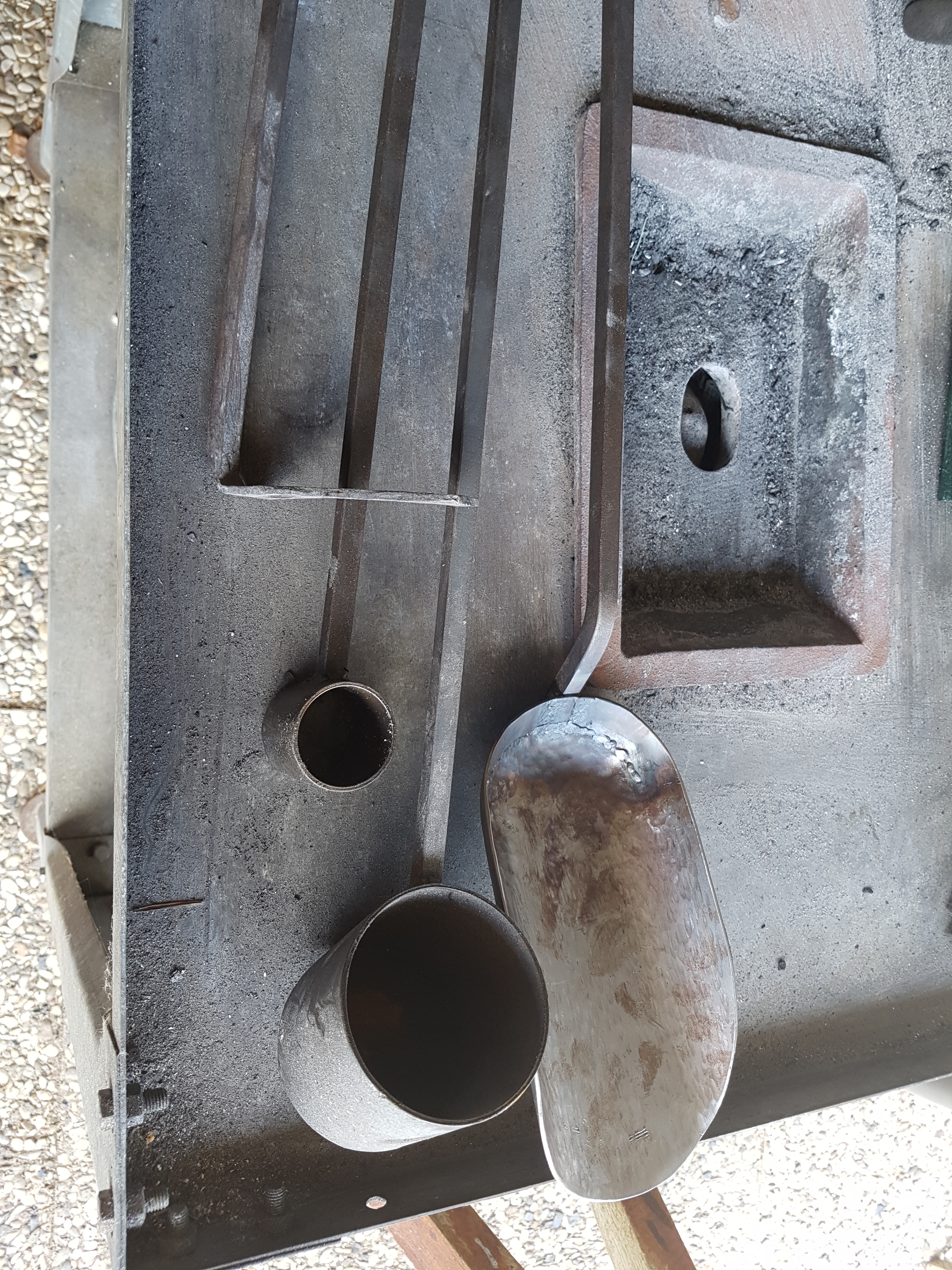 I use two different sizes of ladles. A bigger one for water to coolen down the workpiece or the coal.