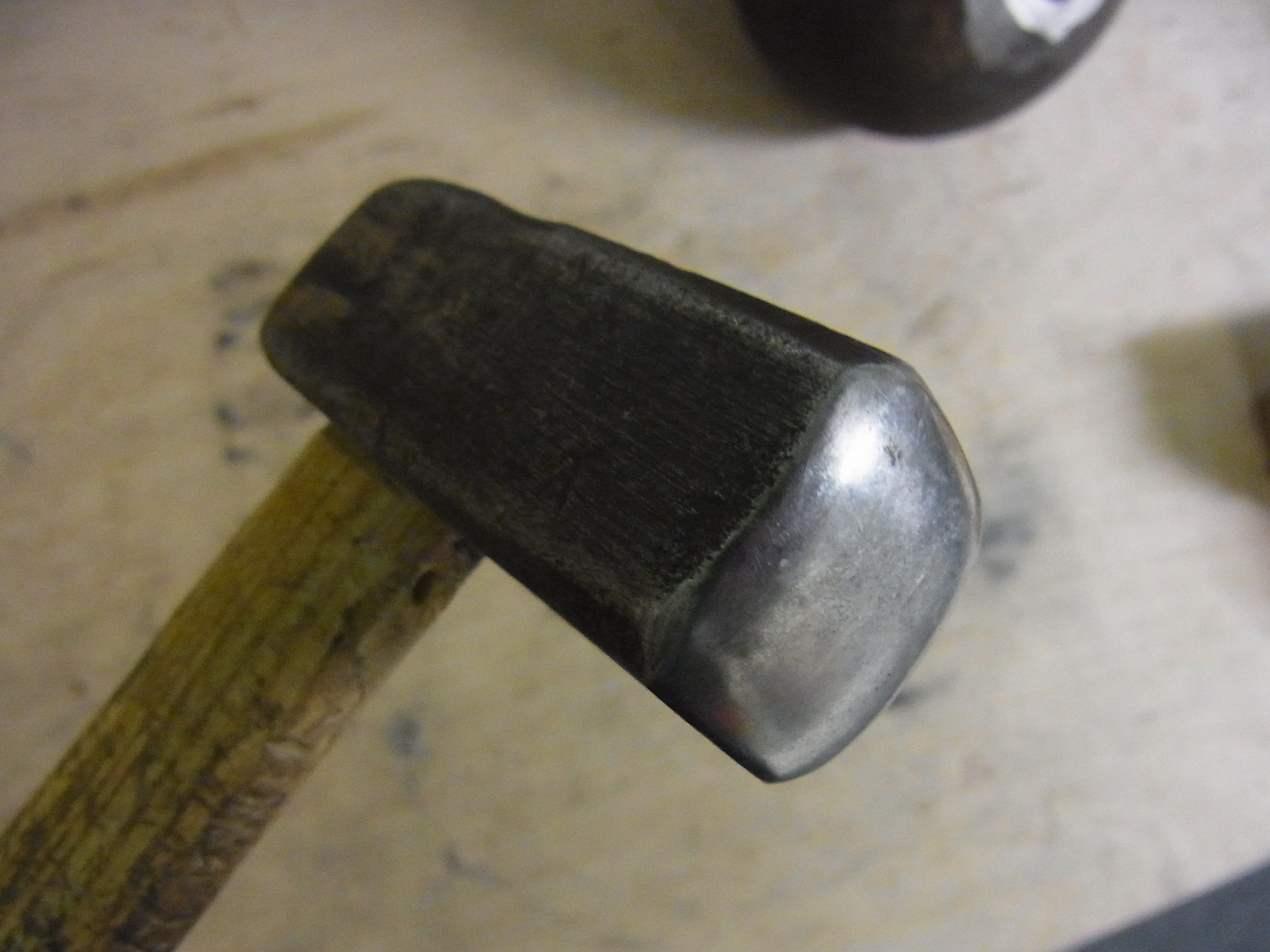 Basis bildet ein gewöhnlicher Schlosserhammer (nicht der günstigste). Dieser wird mit einer Metallsäge oder mit einer Trennscheibe seiner Finne beraubt und die Bahn wird Kugelrund geschlifen.