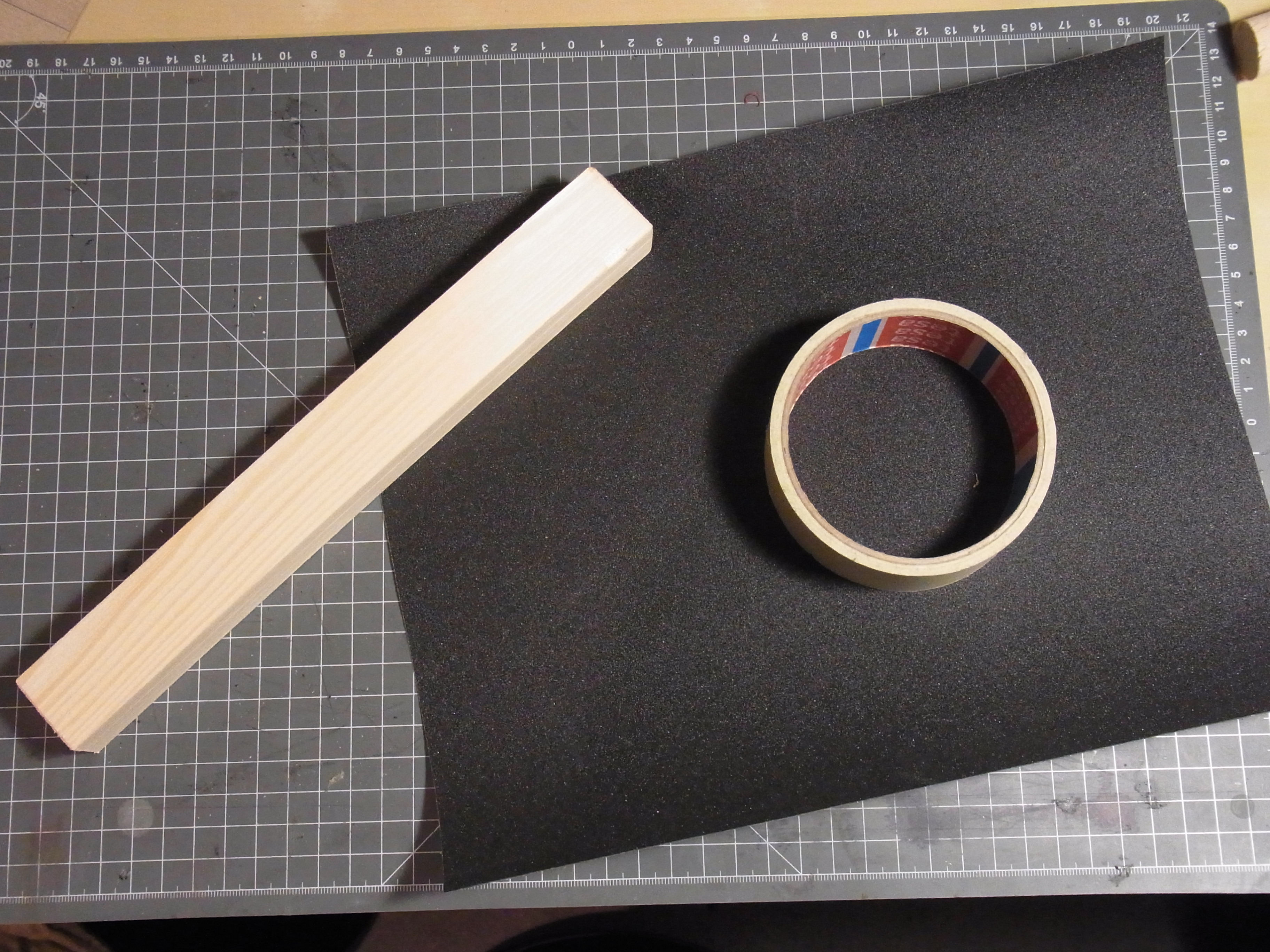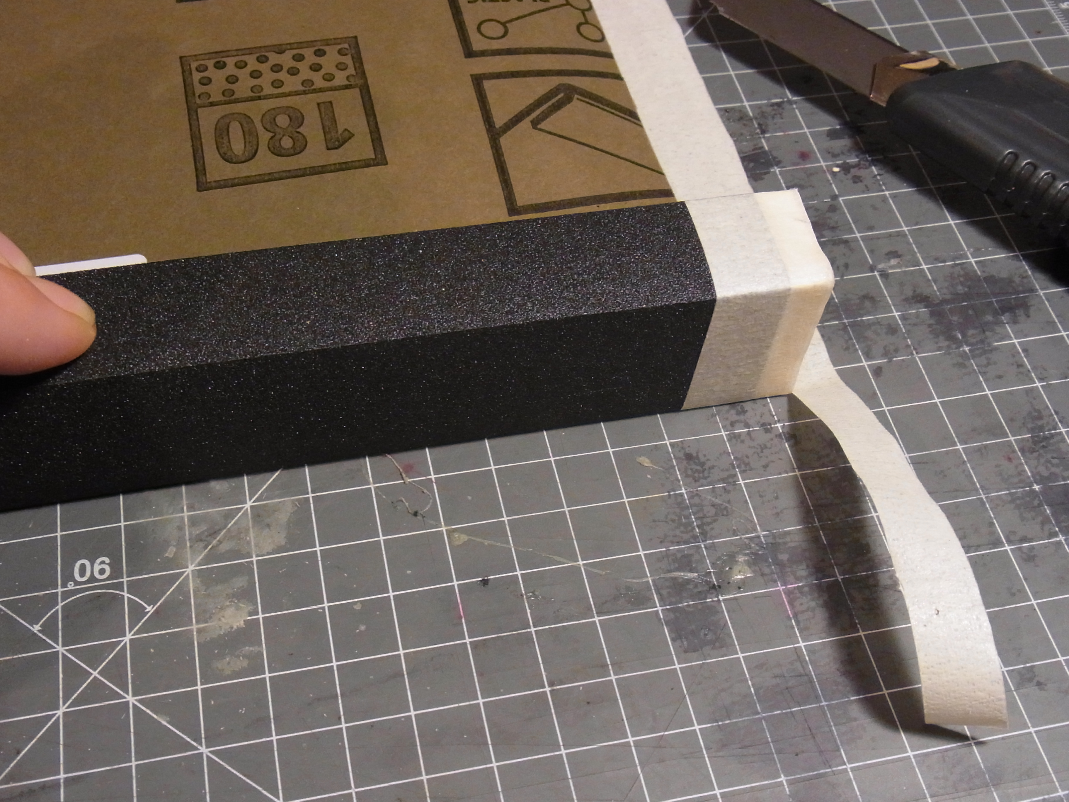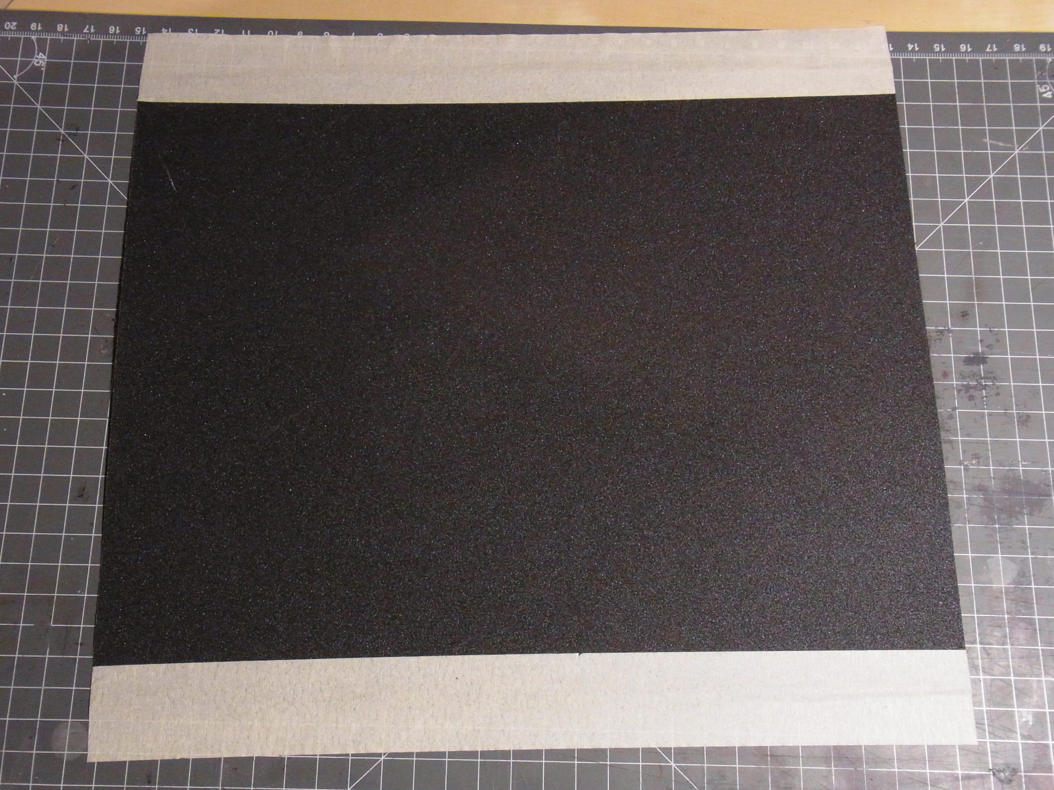 Zuerst Klebe ich das Kreppband auf die langen Seiten des Schleifpapieres.