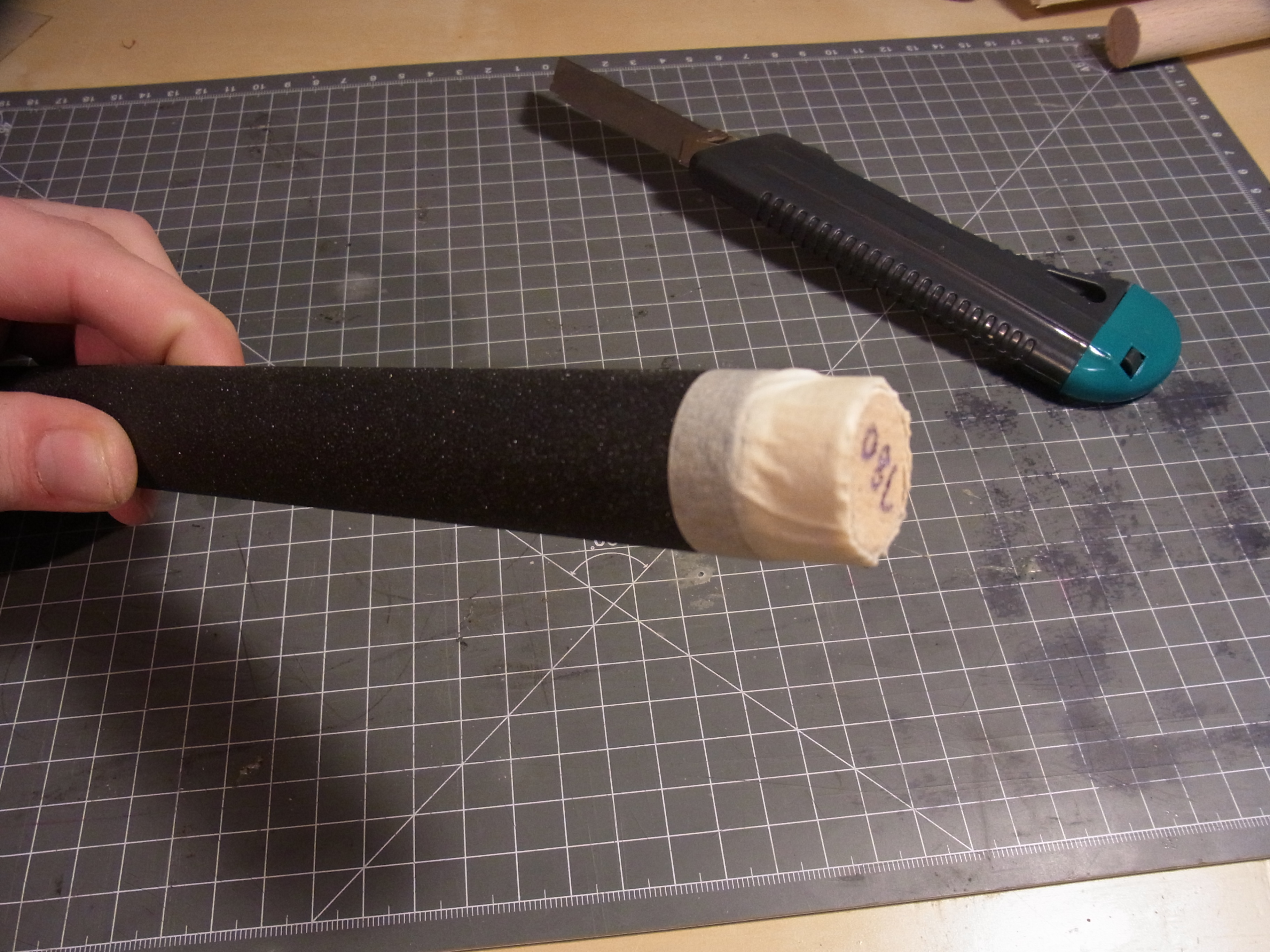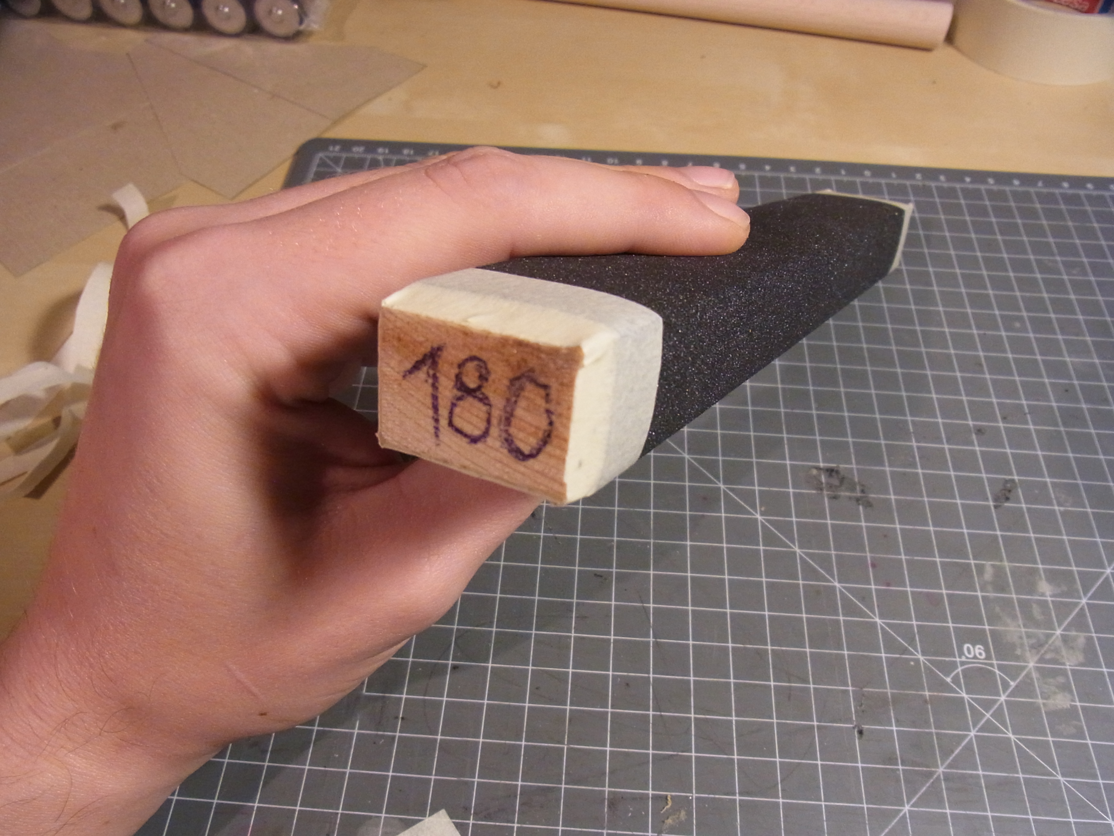 Und schon ist die erste Feile fertig. Da ich die Rückseite des Papieres nicht mehr sehen kann schreibe ich noch die Körnung auf das Holz.