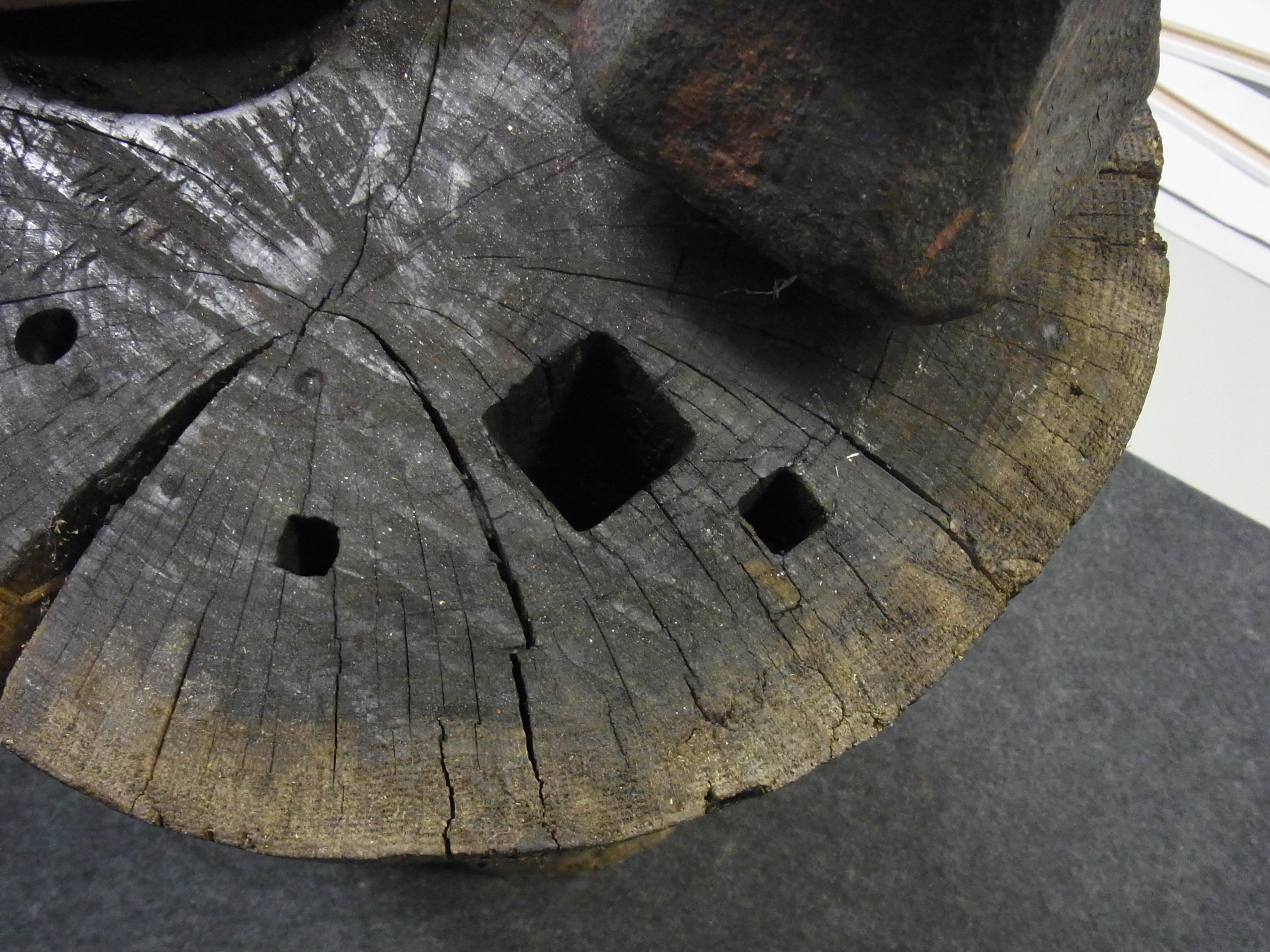 Die Löcher sind Vorgebort und dann mit einem Glühenden Stahl der passenden Form ausgebrannt.